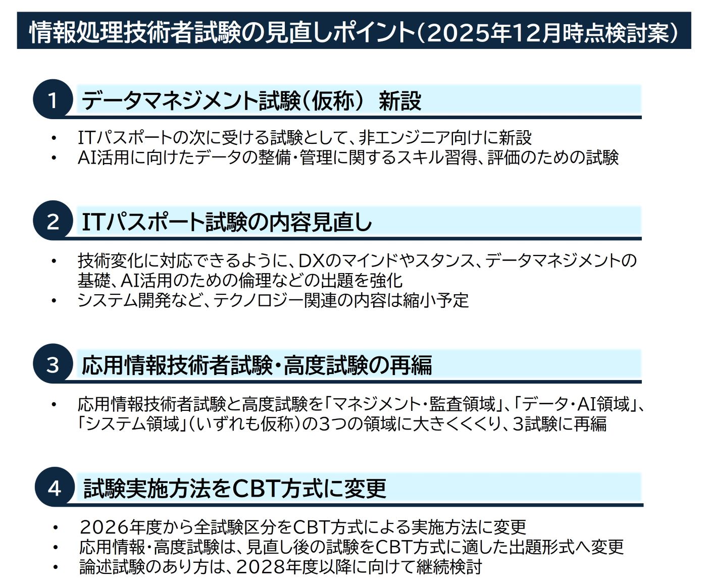 「マネジメント・監査」、「データ・AI」、「システム」(いずれも2025年12月時点の仮称)の3つの領域に大きくくくり、3試験に再編