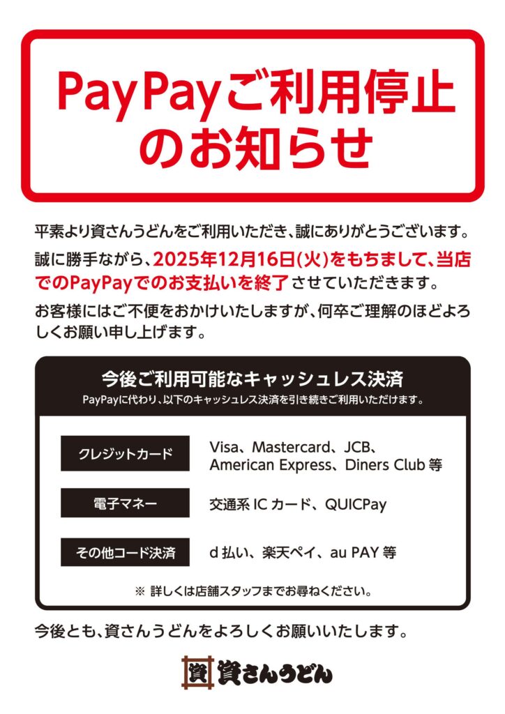 誠に勝手ながら2025年12月16日(火)をもちまして、当店でのPayPayでのお支払いを終了させていただきます。