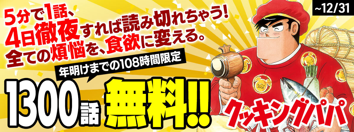 講談社の漫画サービス「コミックDAYS」は12月27日正午から、グルメマンガ『クッキングパパ』1300話分を108時間(2023年内)限定で無料公開すると告知しました。