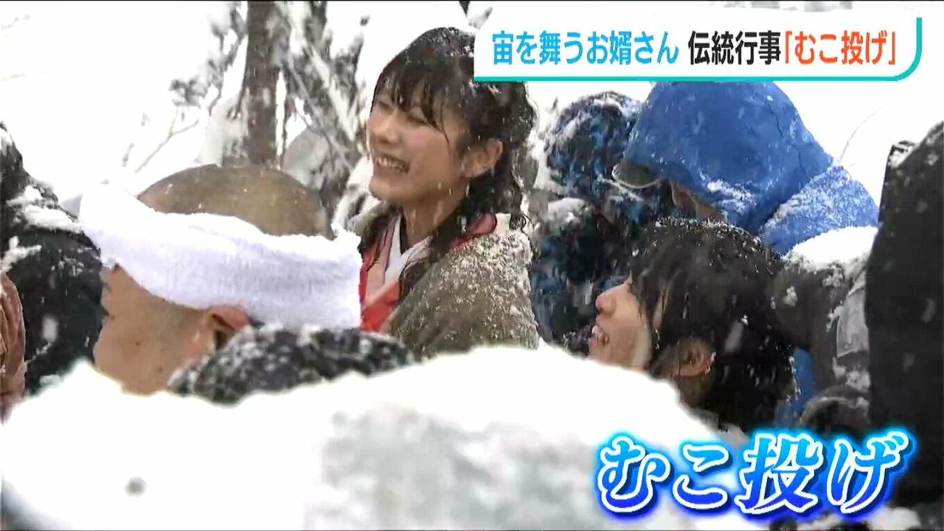 新潟県 十日町市 松之山地域に伝わる奇祭『むこ投げ・すみ塗り』が15日行われ、今年は2人のお婿さんが真新しい雪に向かって勢いよく宙を舞いました。