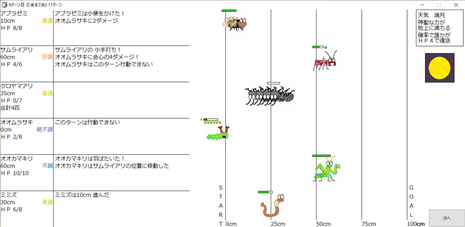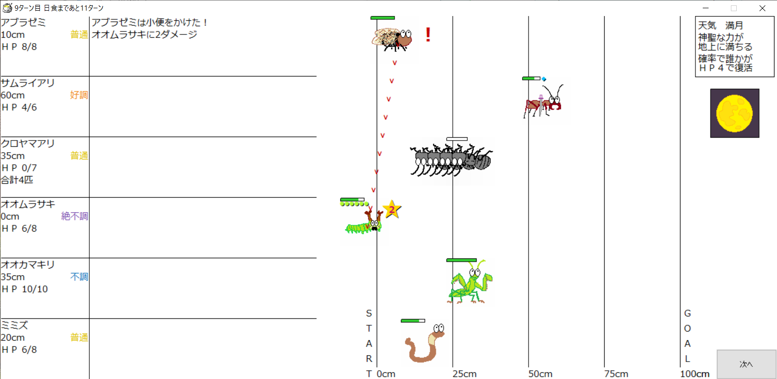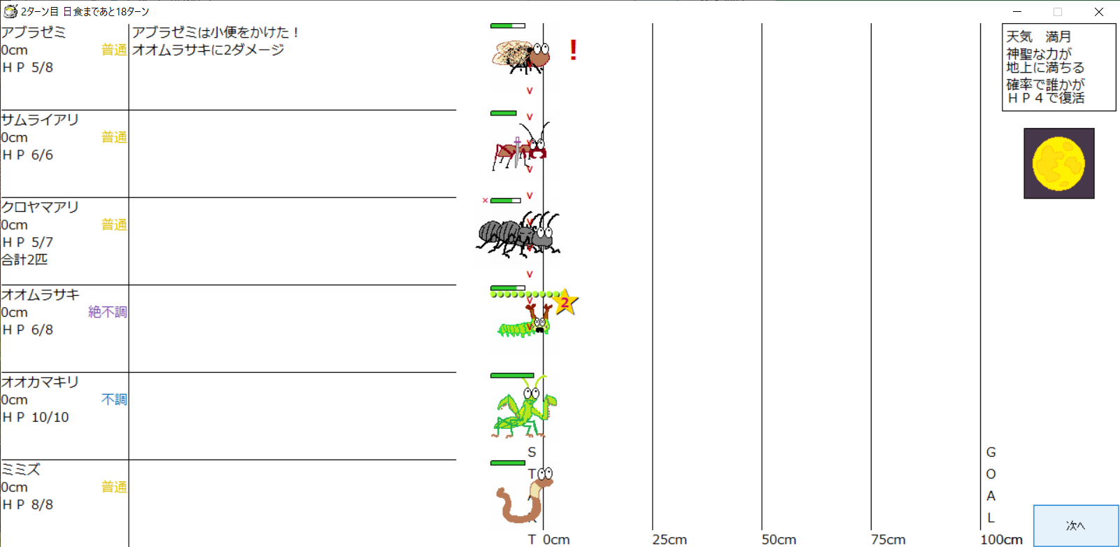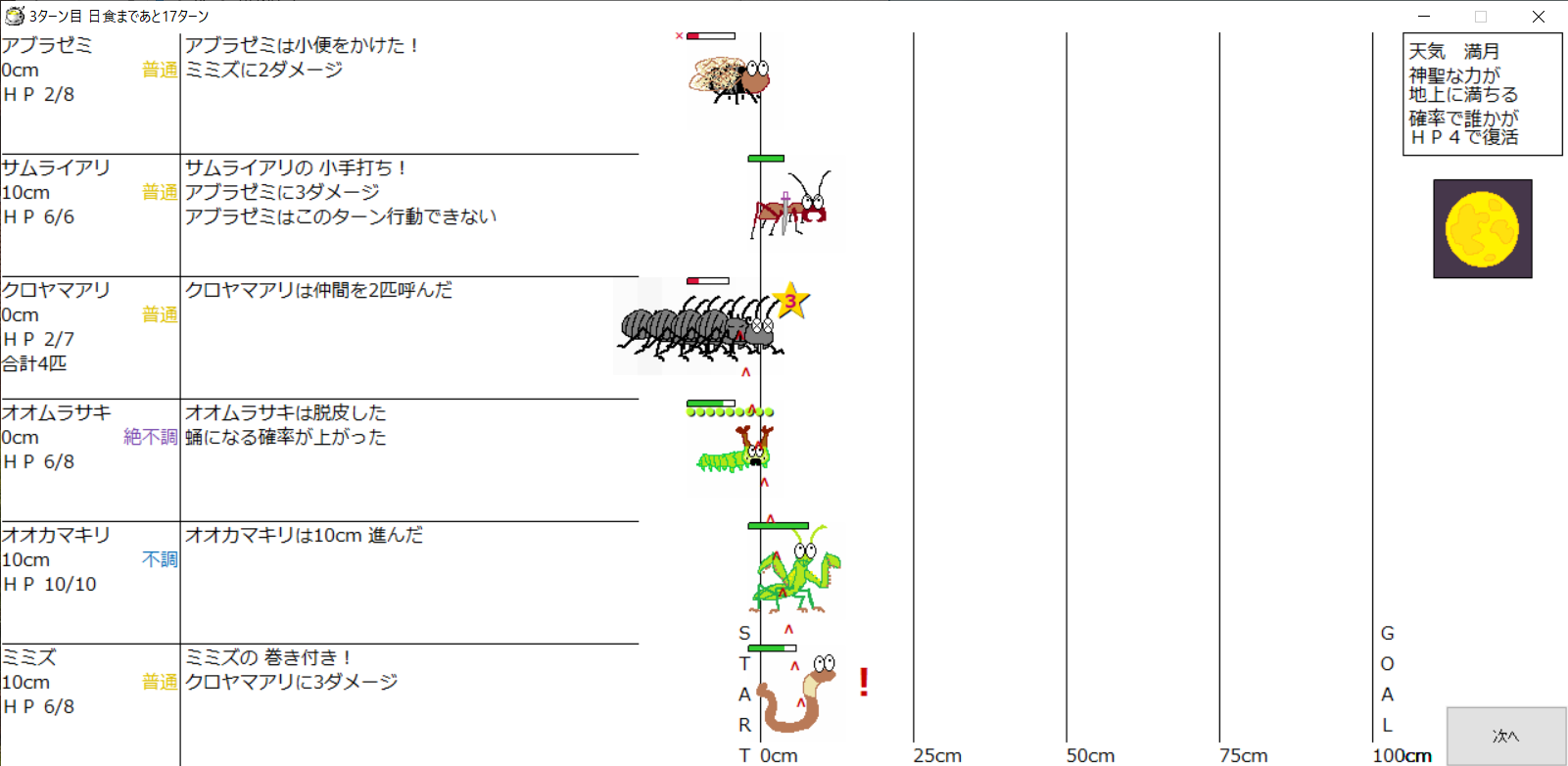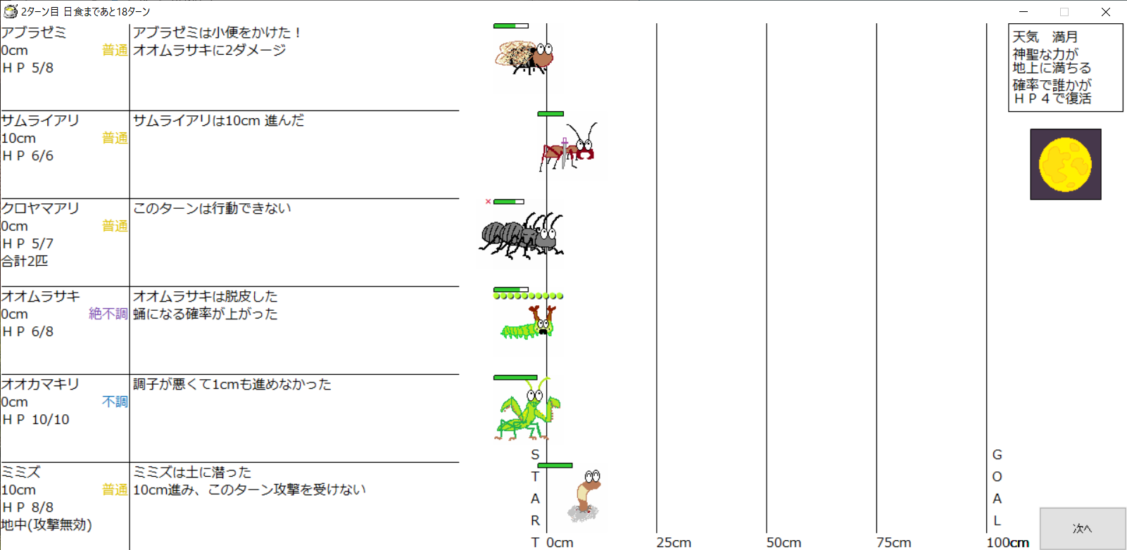 ・1番上の虫さんから順番に行動。行動の抽選は全て乱数に従う