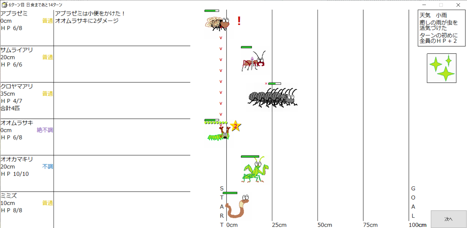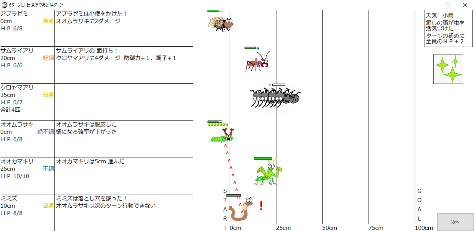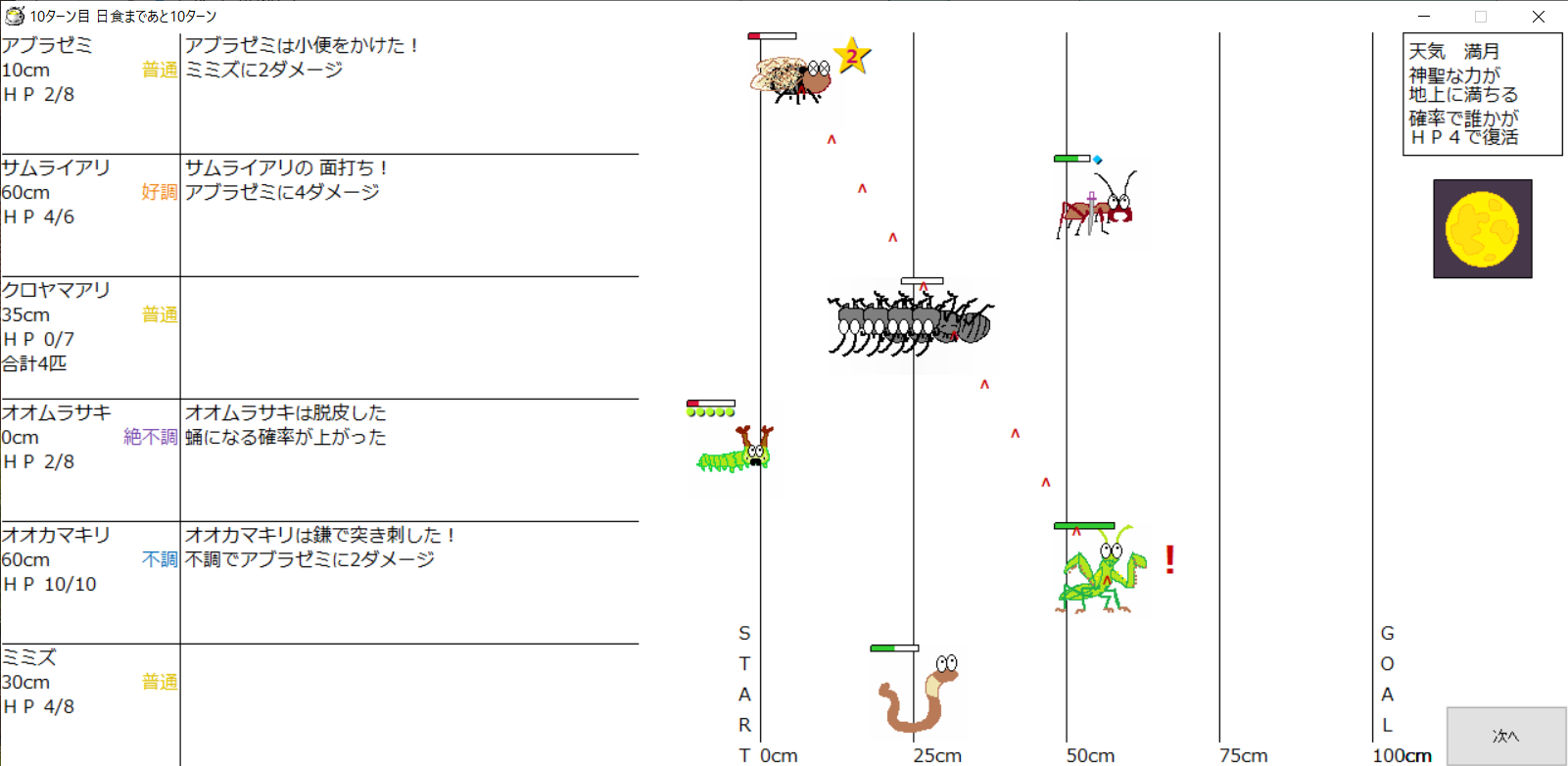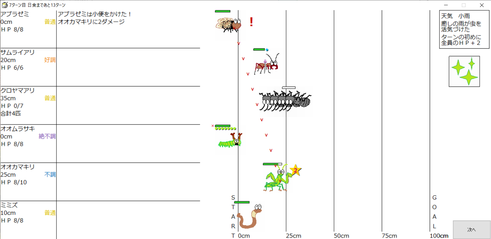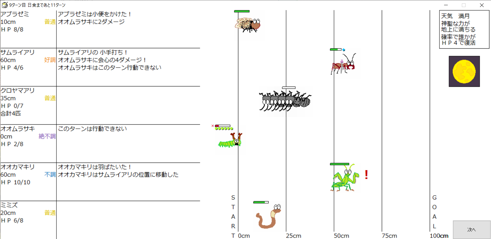 ・1番上の虫さんから順番に行動。行動の抽選は全て乱数に従う