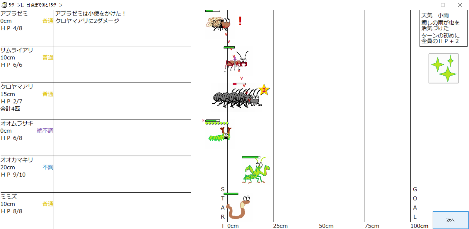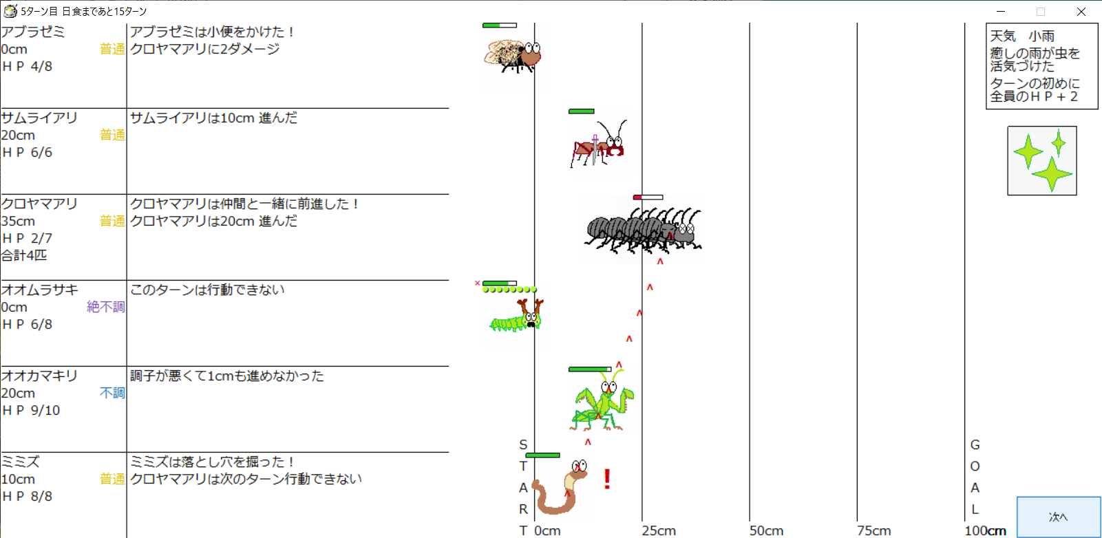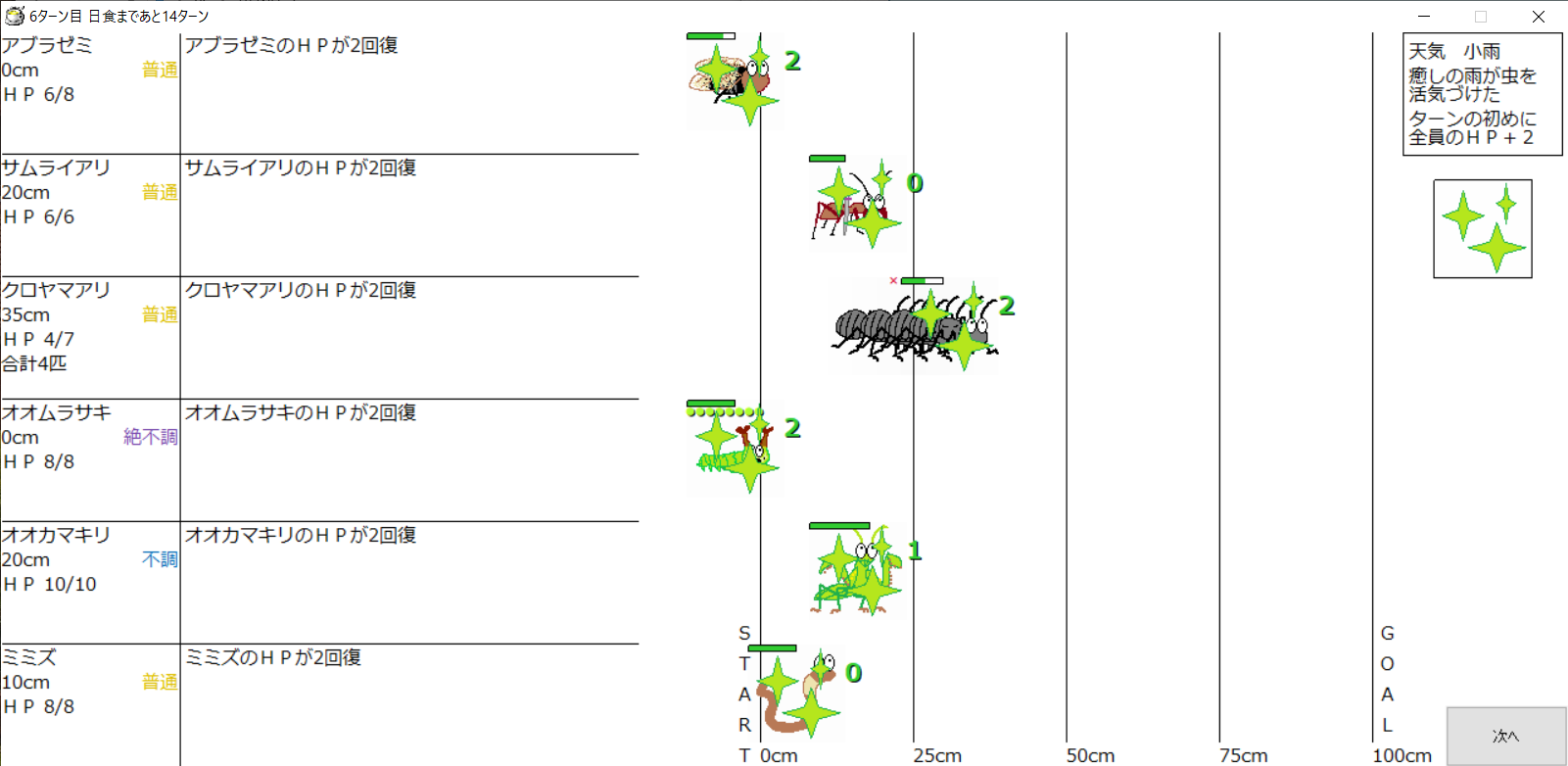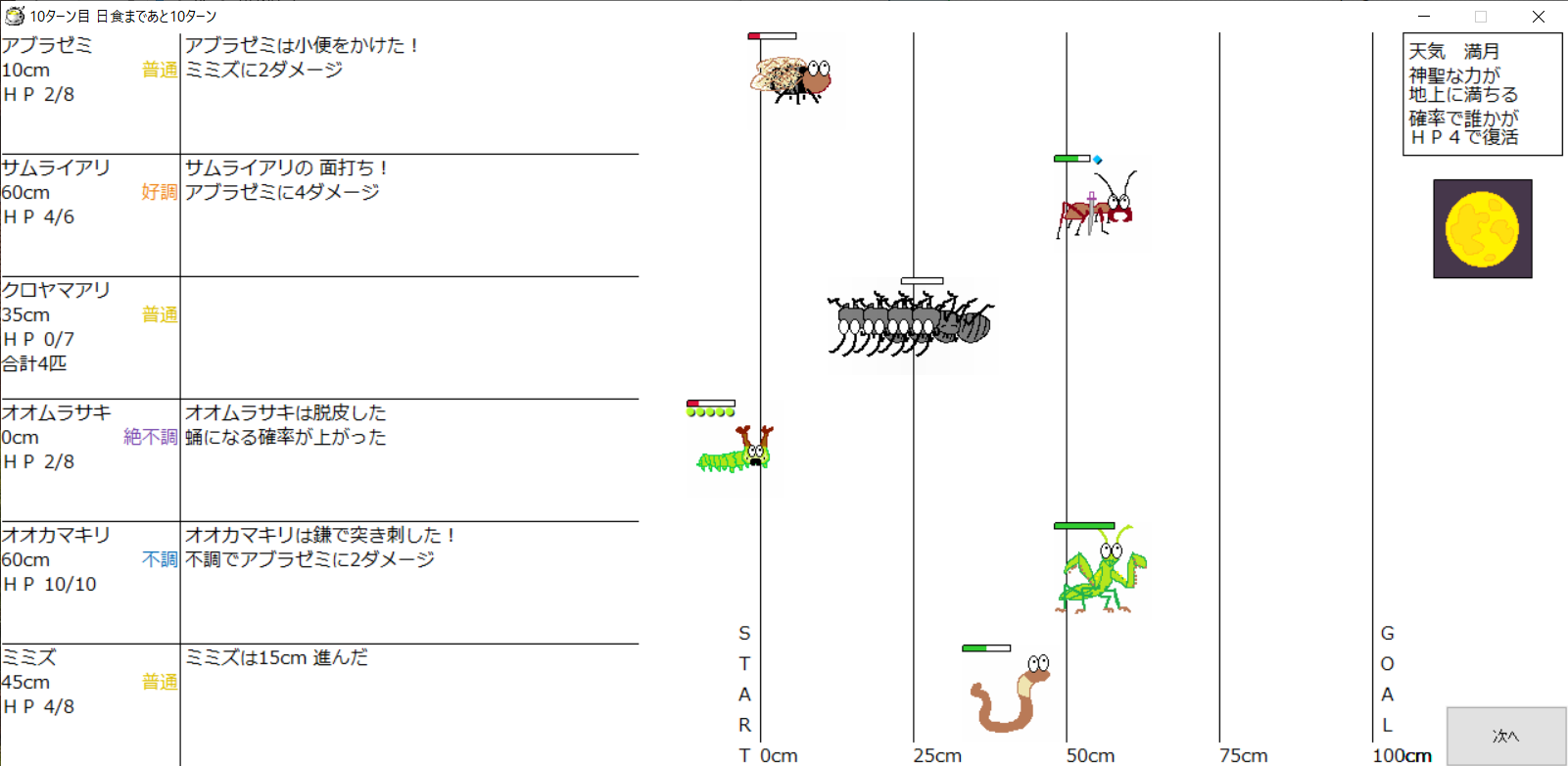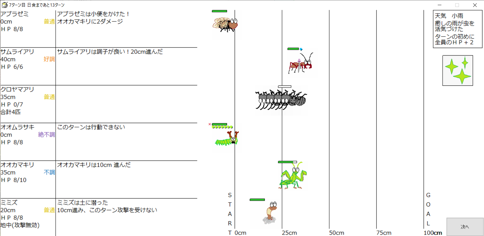 ・1番上の虫さんから順番に行動。行動の抽選は全て乱数に従う