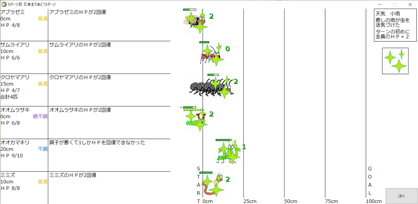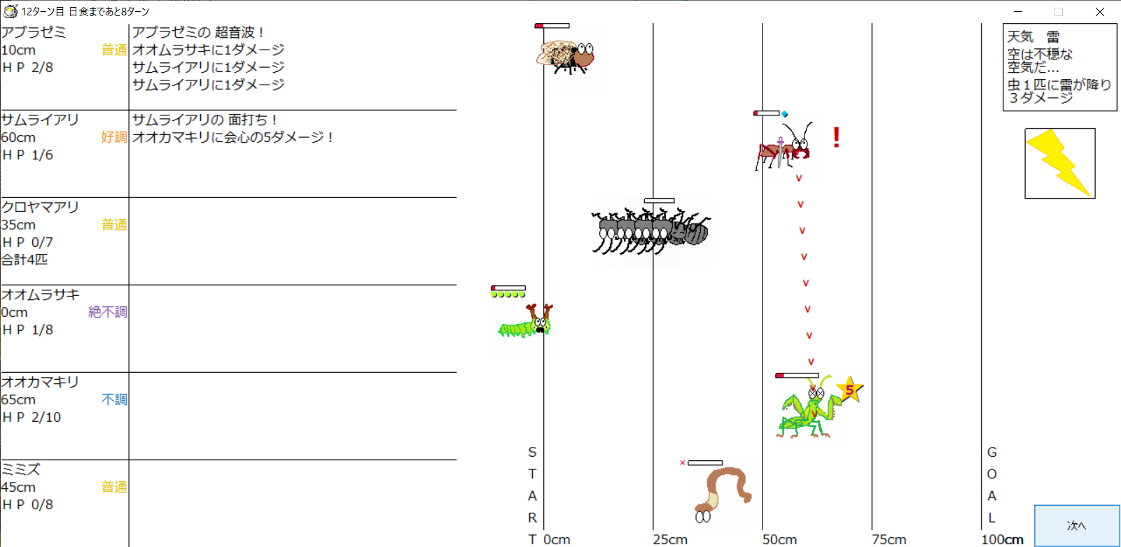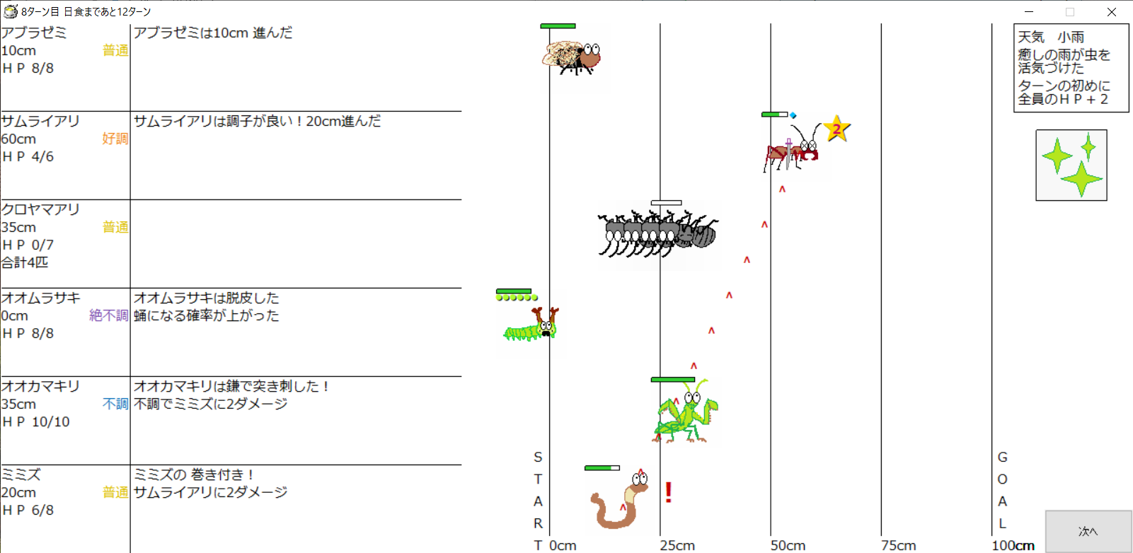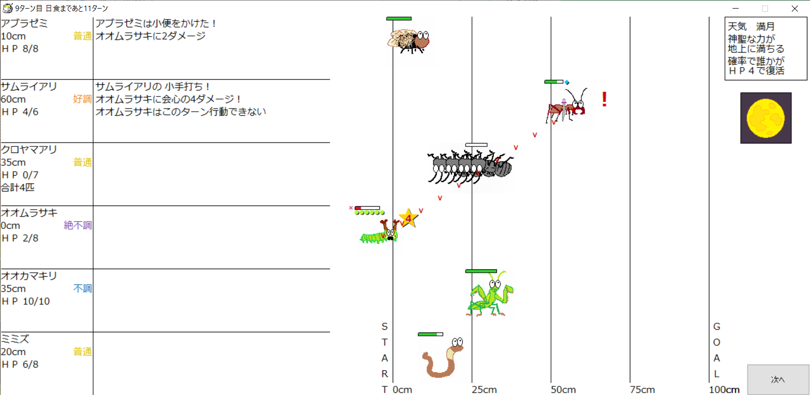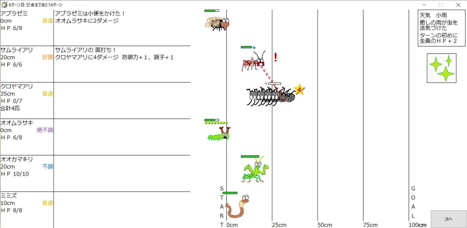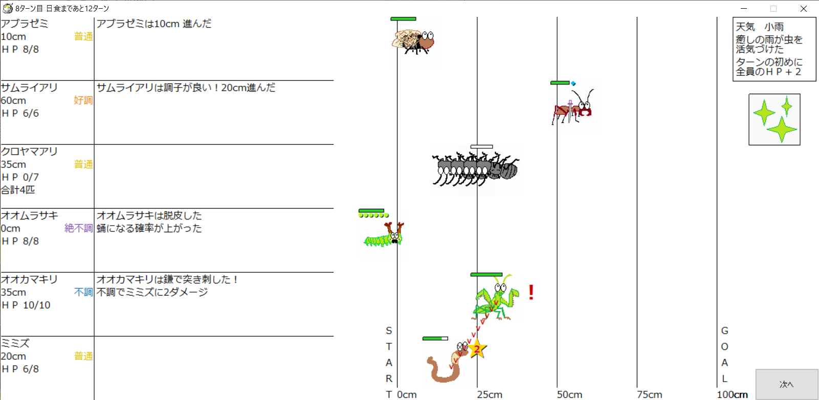 ・1番上の虫さんから順番に行動。行動の抽選は全て乱数に従う