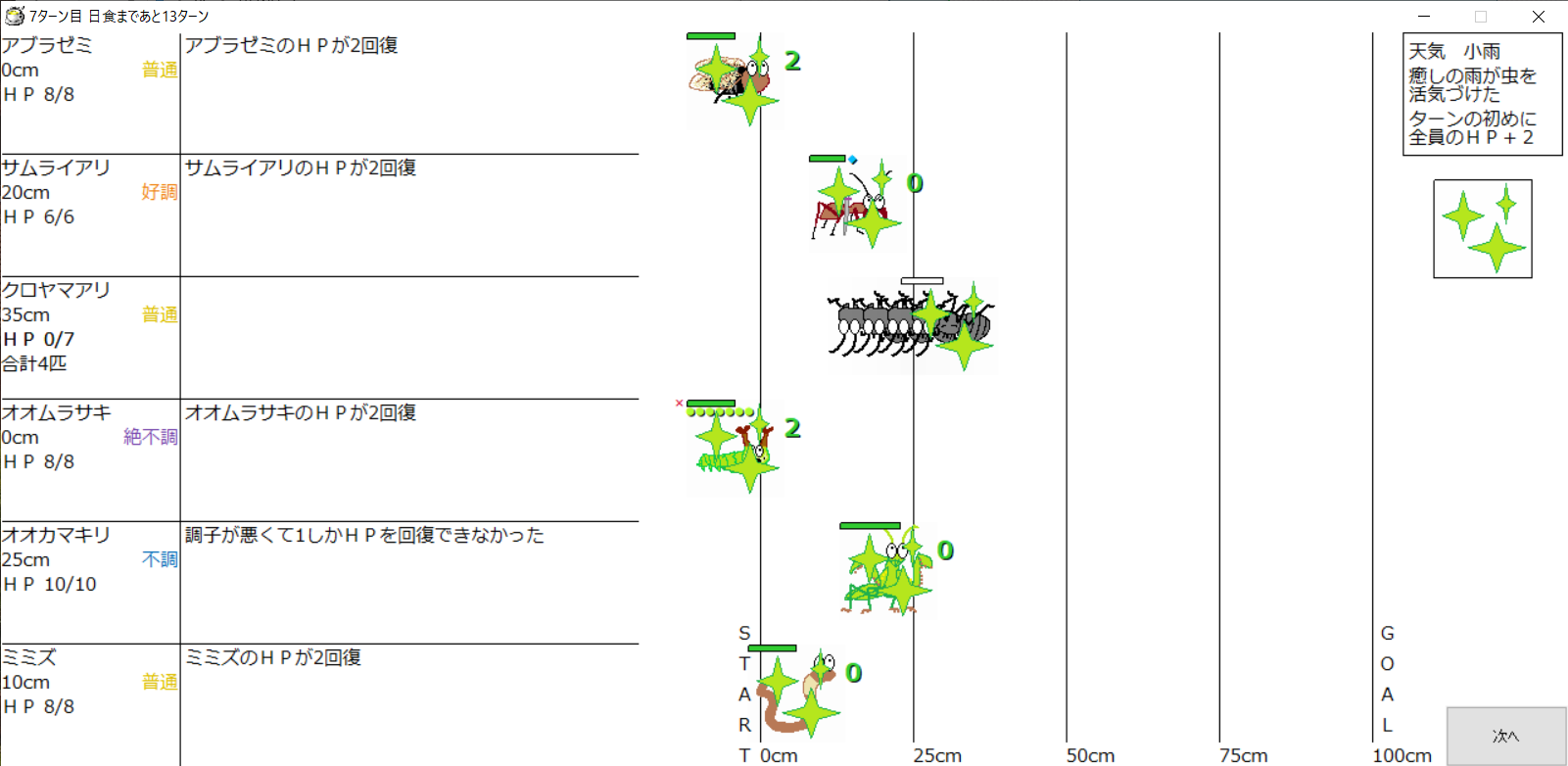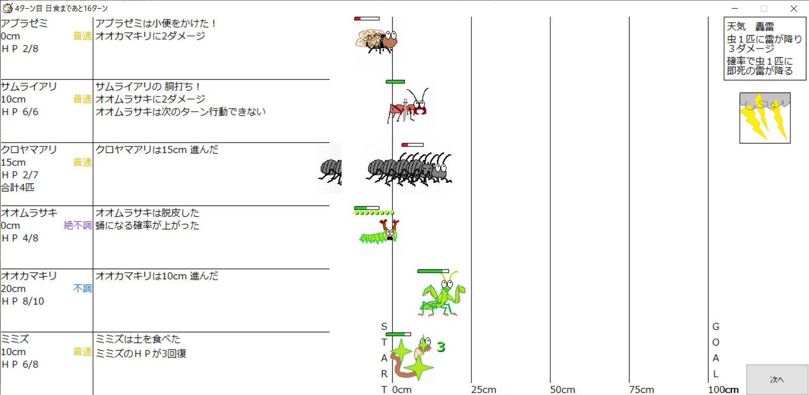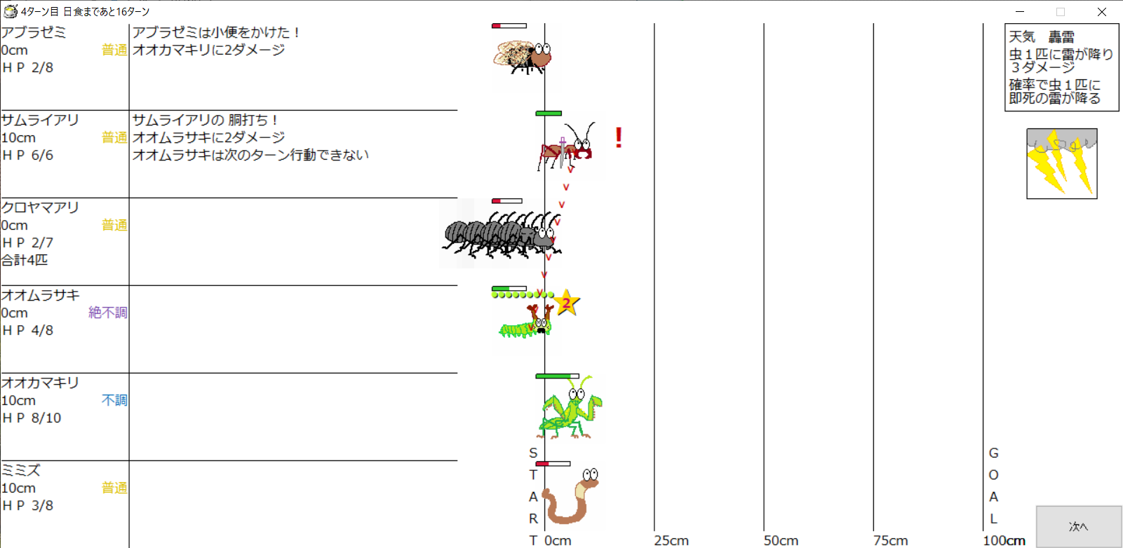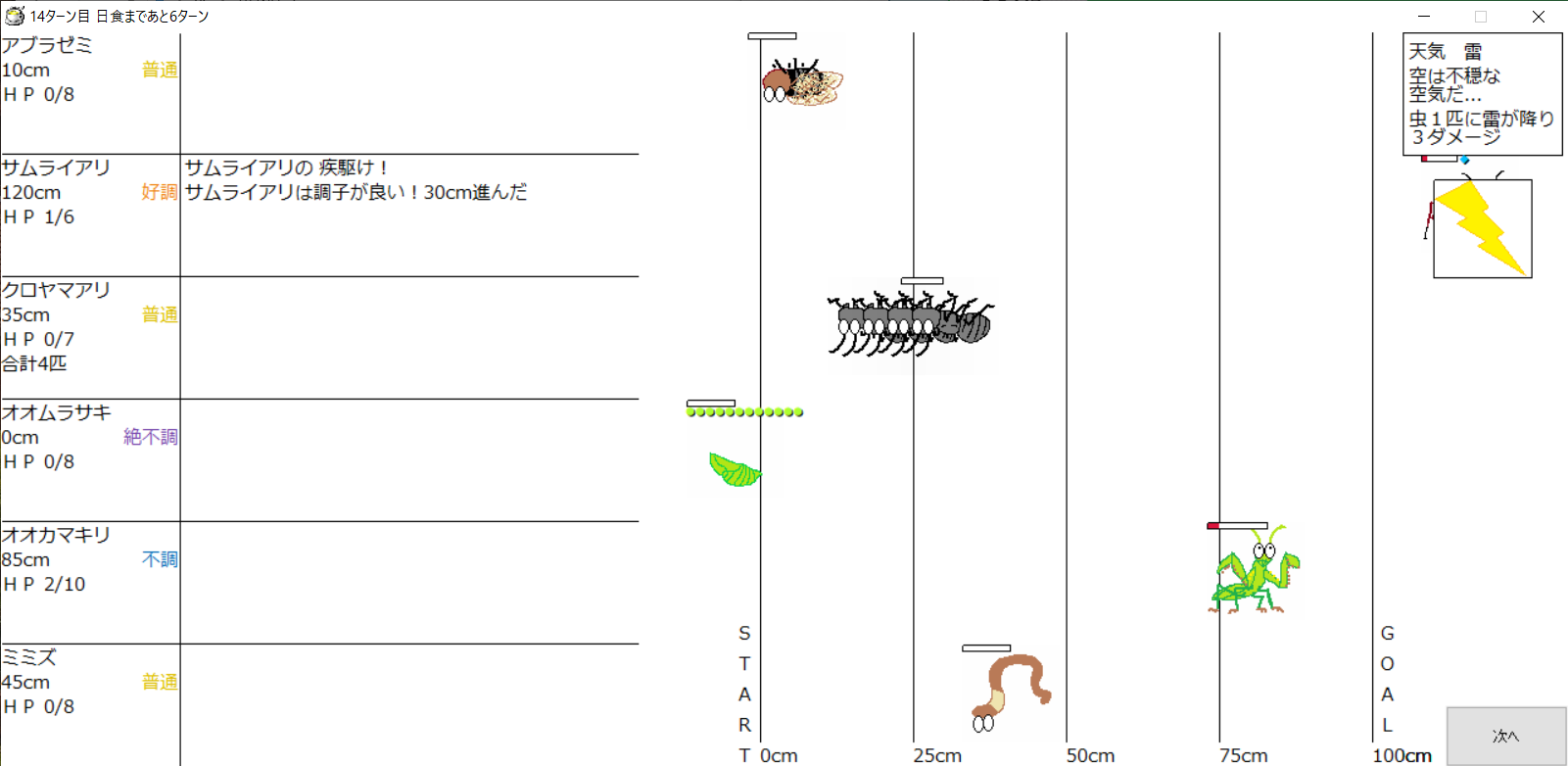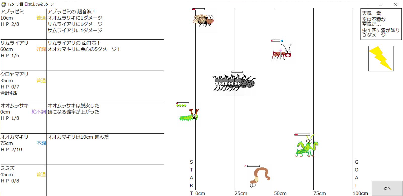 ・1番上の虫さんから順番に行動。行動の抽選は全て乱数に従う