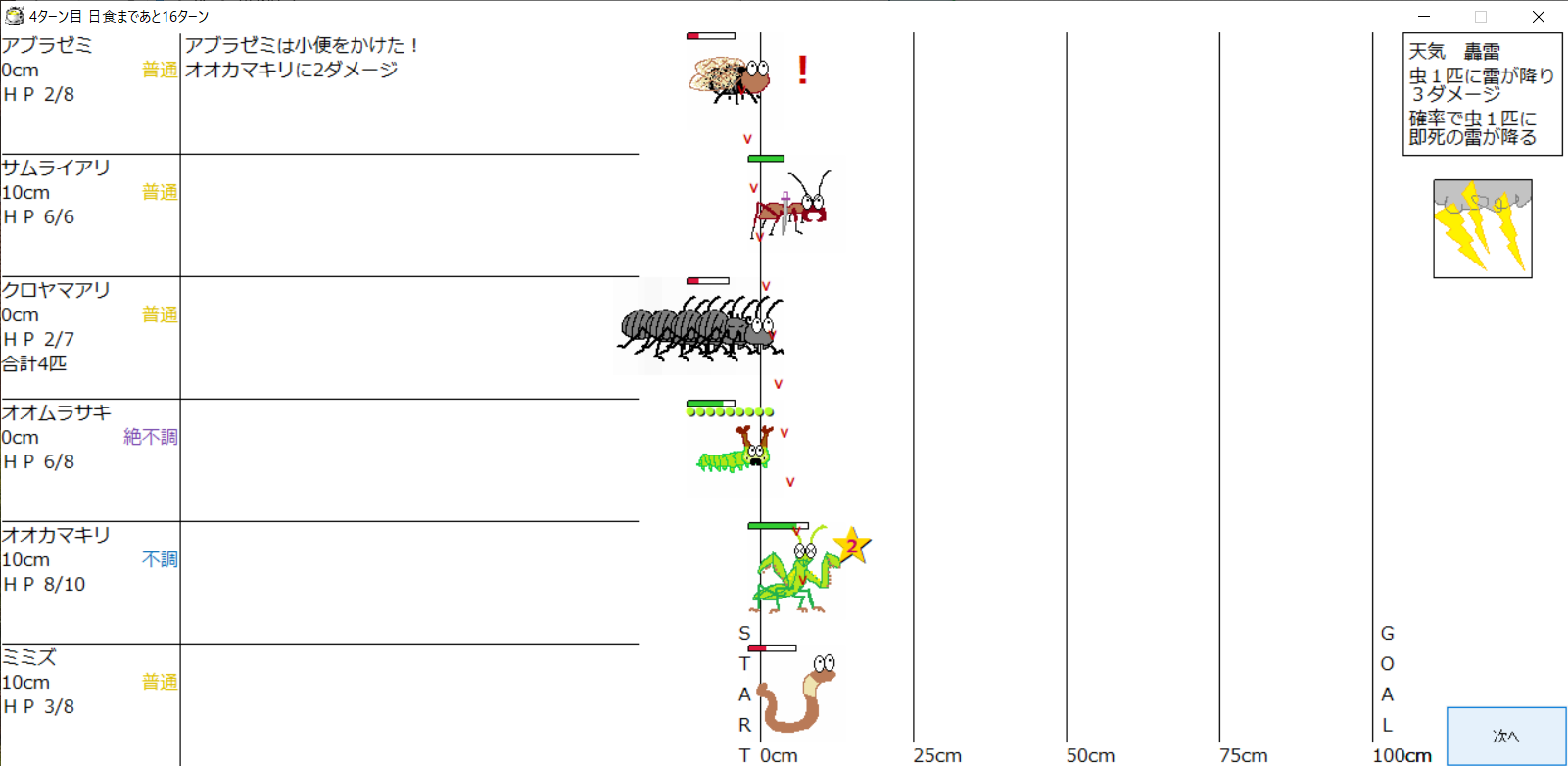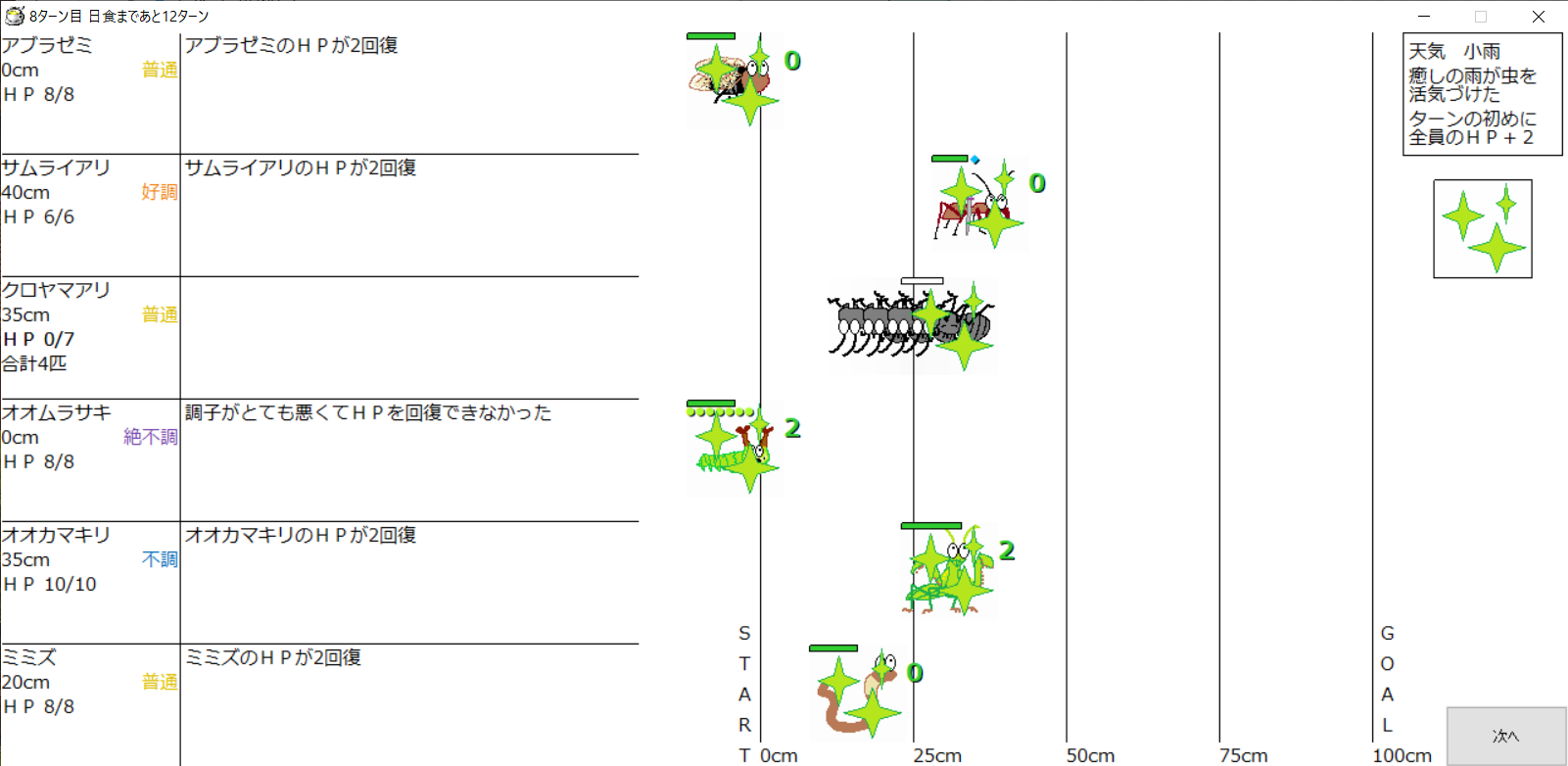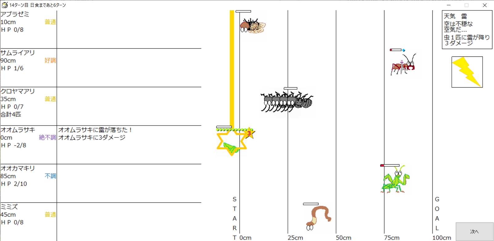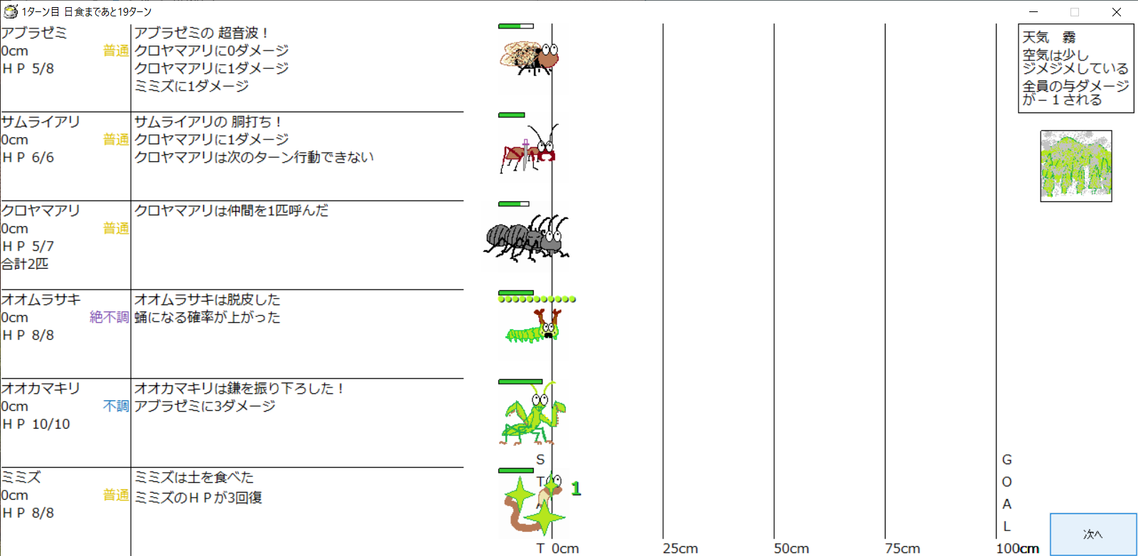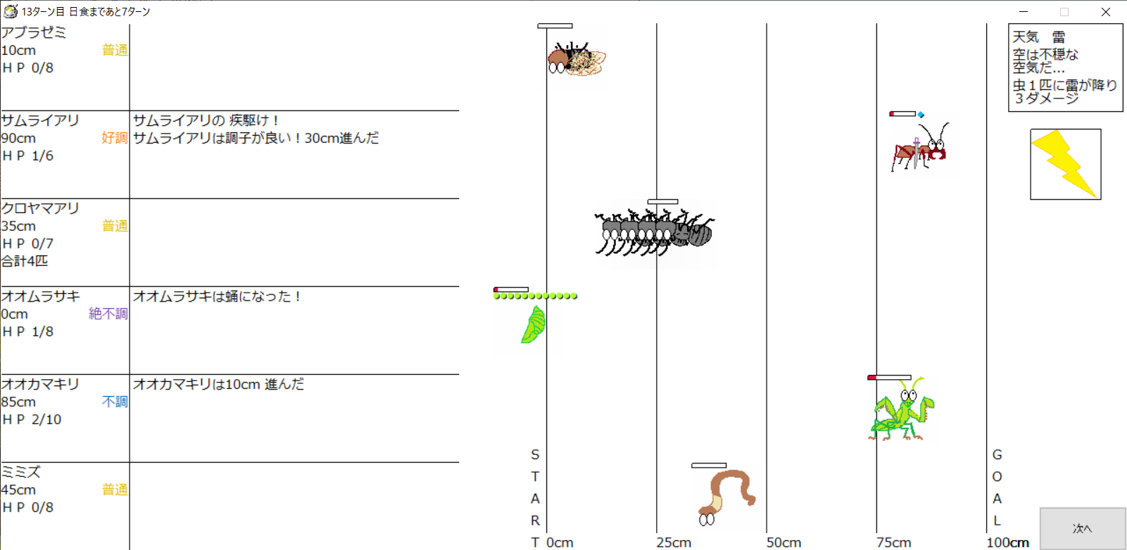 ・1番上の虫さんから順番に行動。行動の抽選は全て乱数に従う