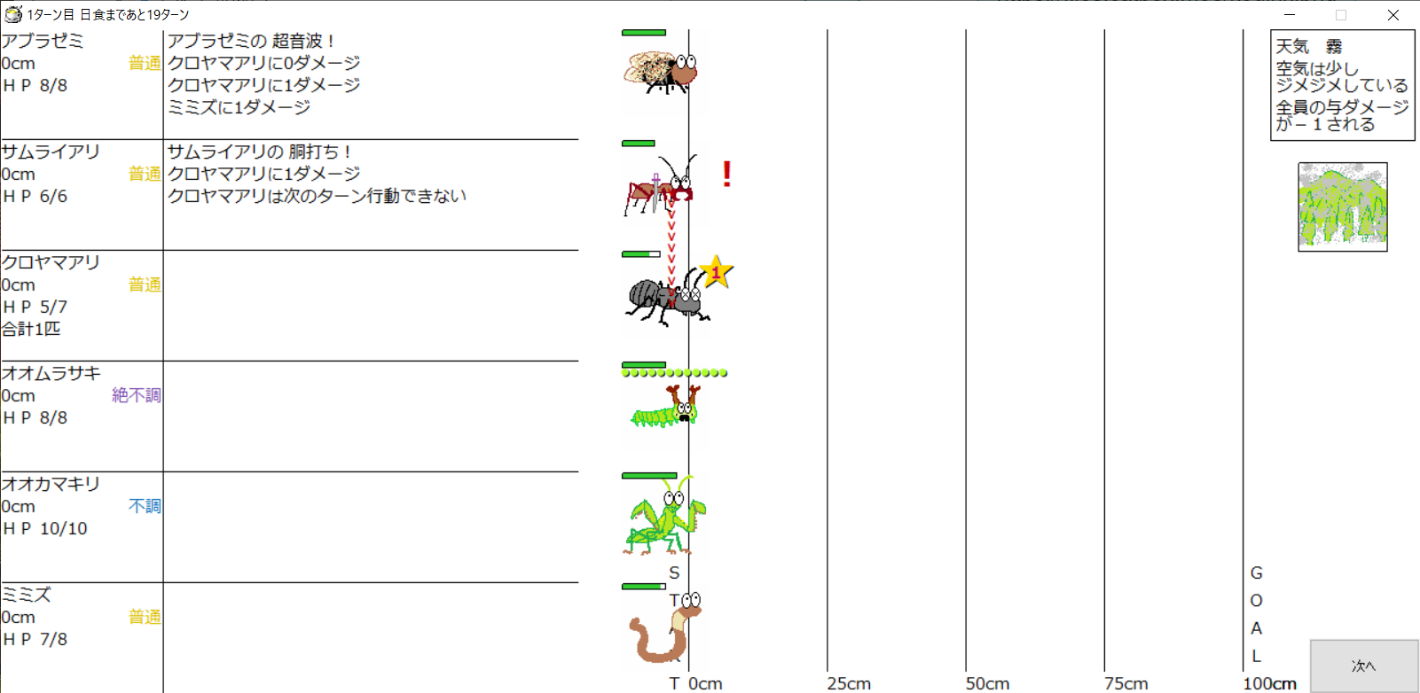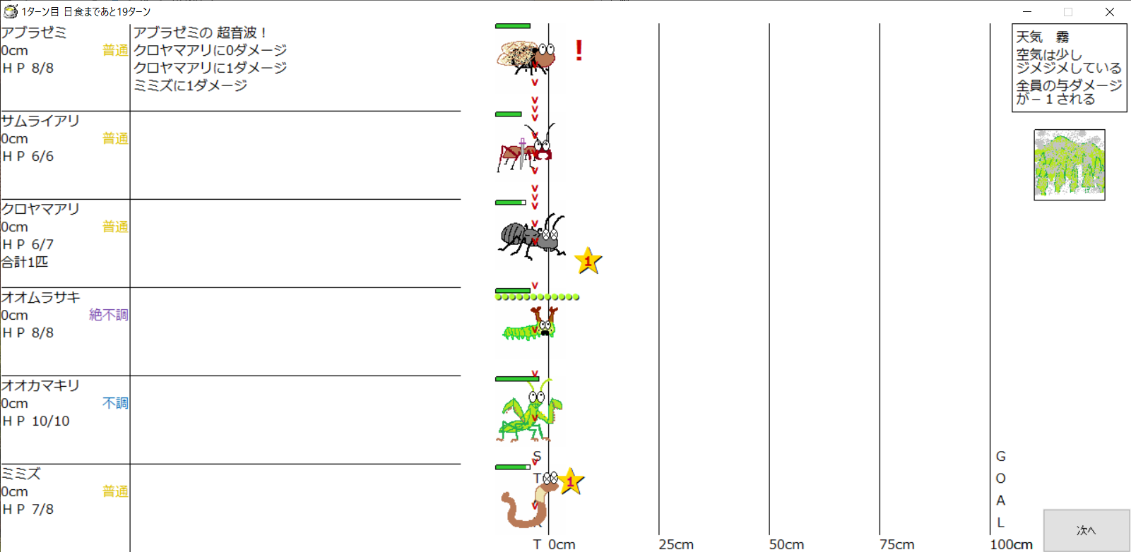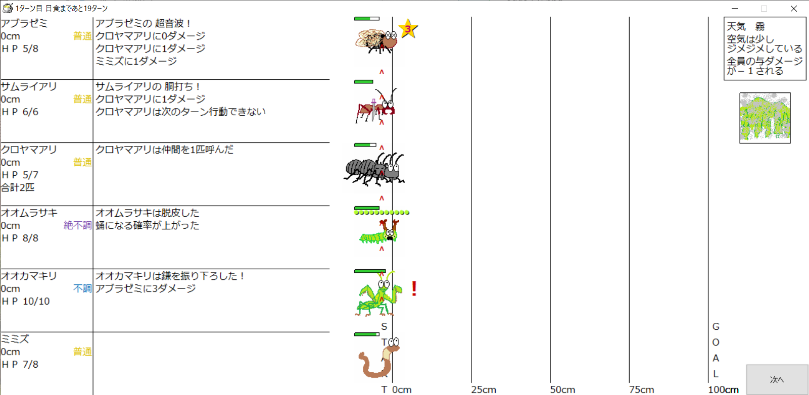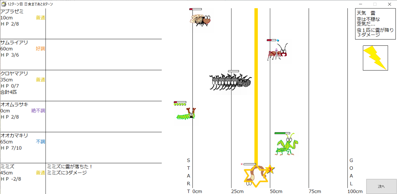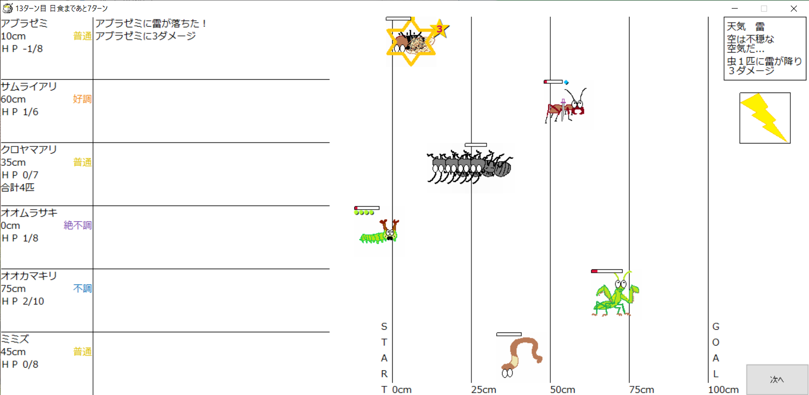 ・1番上の虫さんから順番に行動。行動の抽選は全て乱数に従う