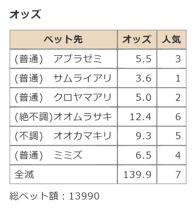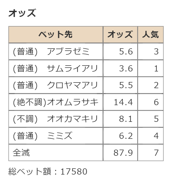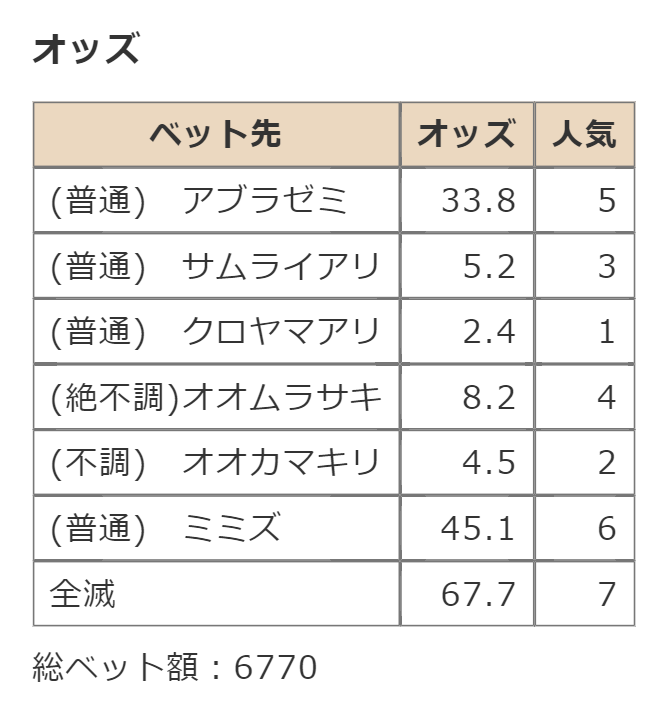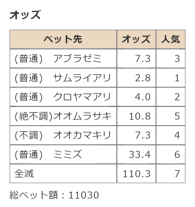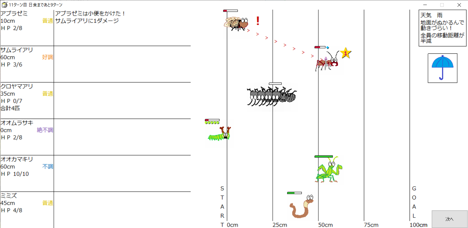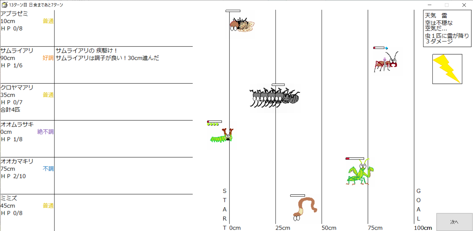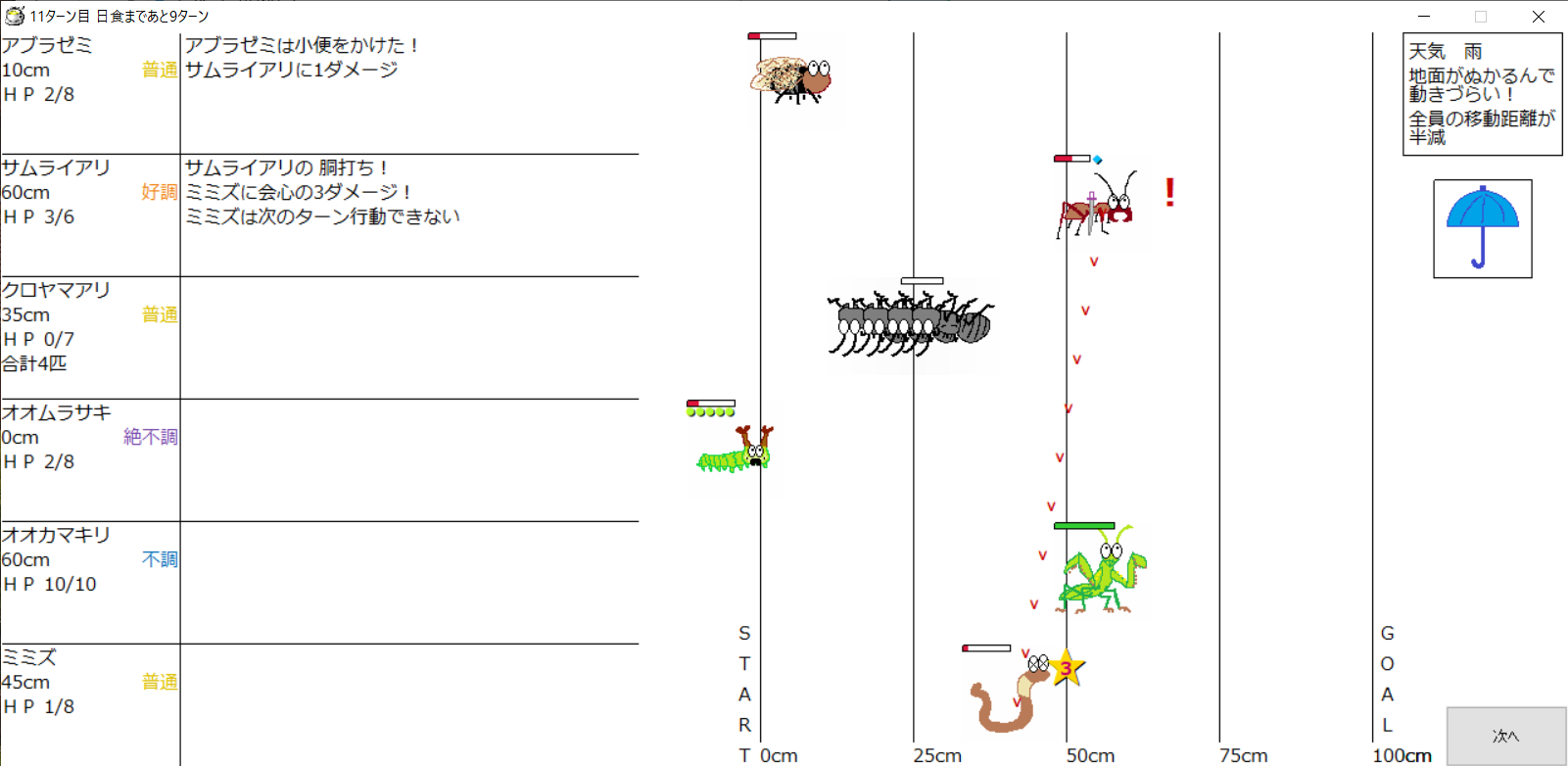 ・一番先にゴールした虫さん、または他のライバルを全滅させた虫さんの勝利
