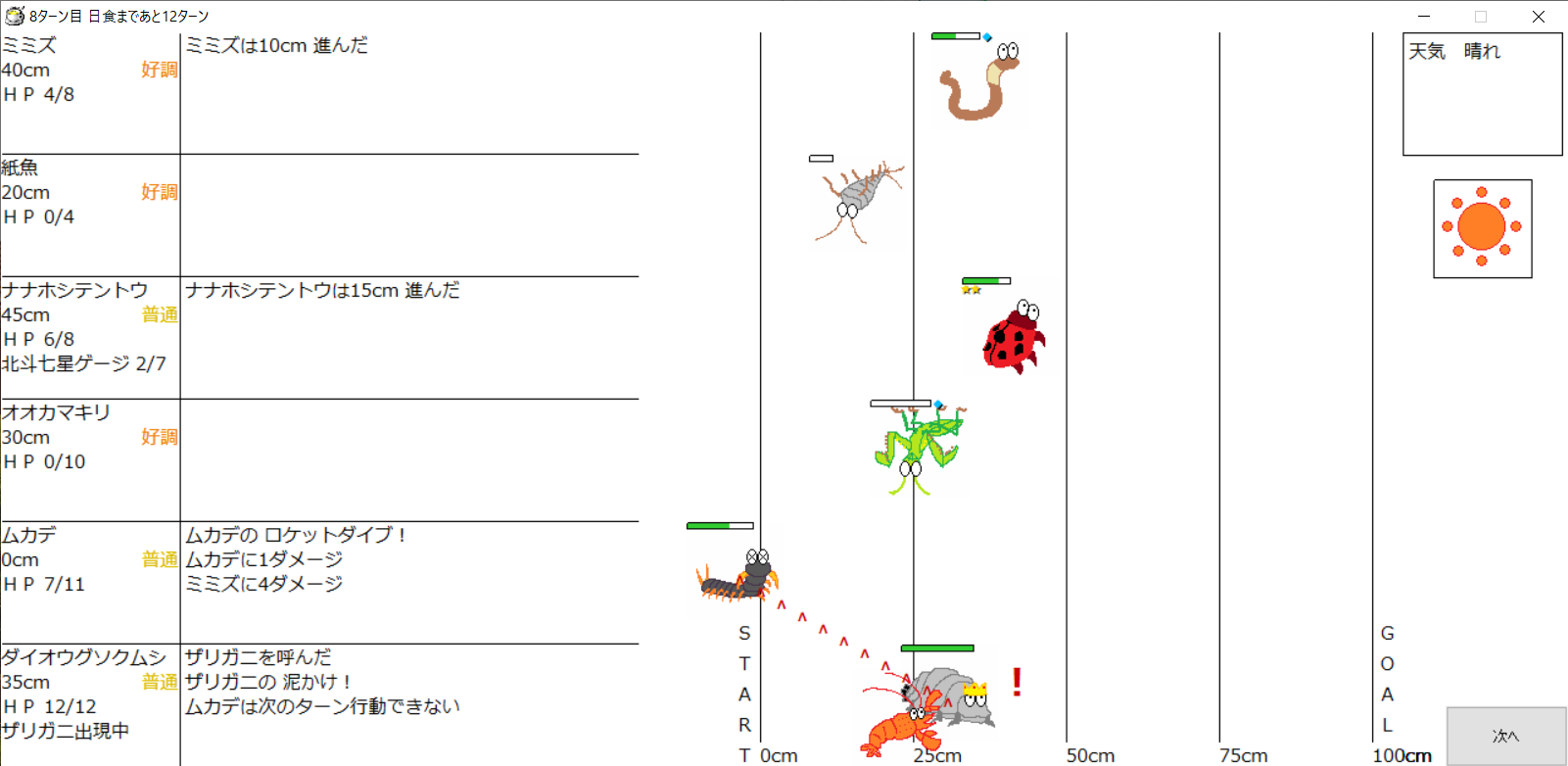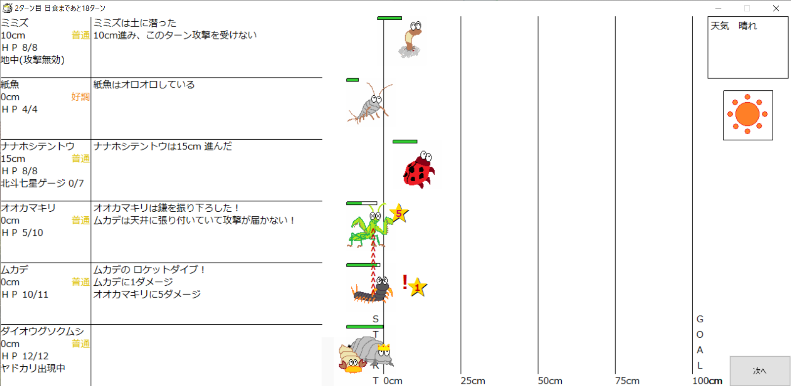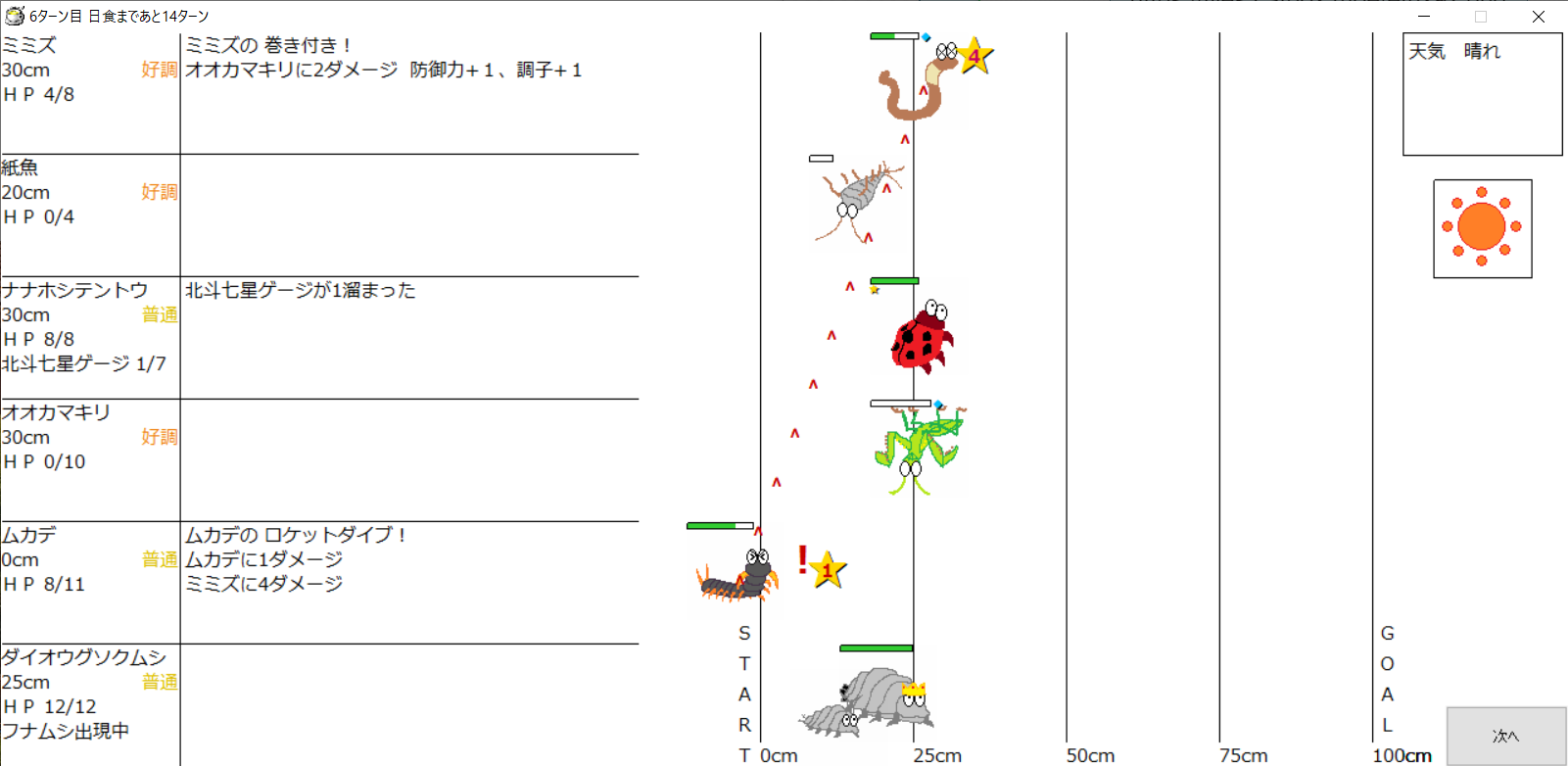 ・一番先にゴールした虫さん、または他のライバルを全滅させた虫さんの勝利