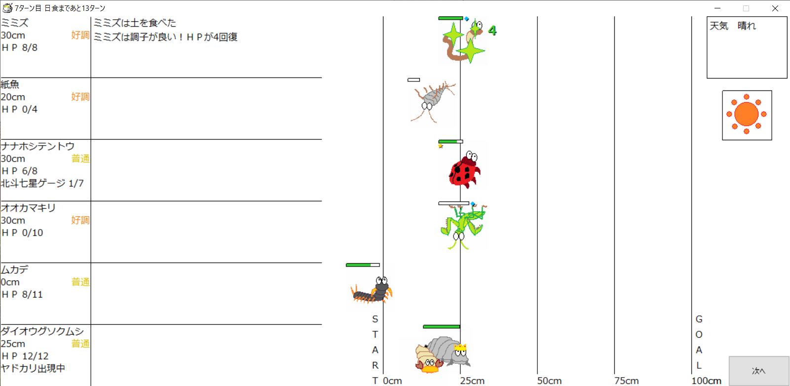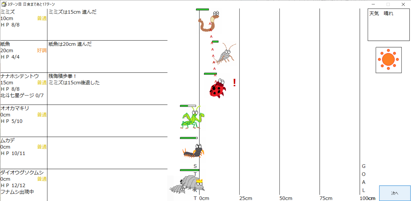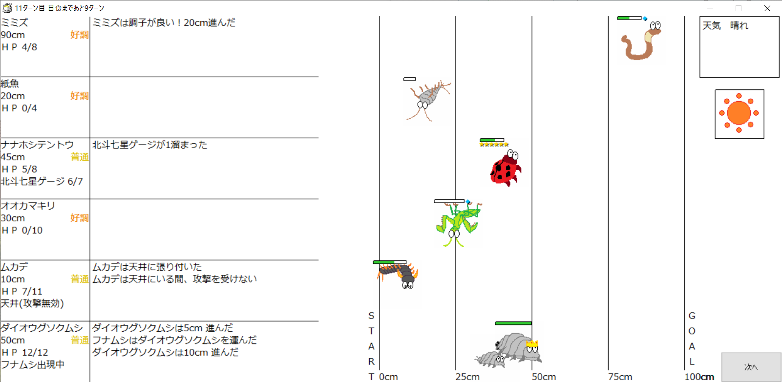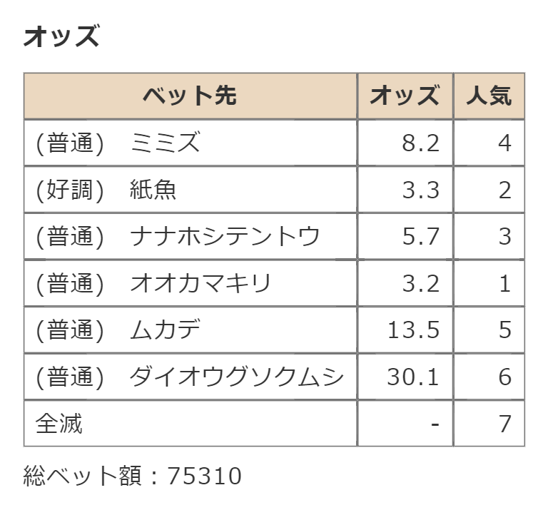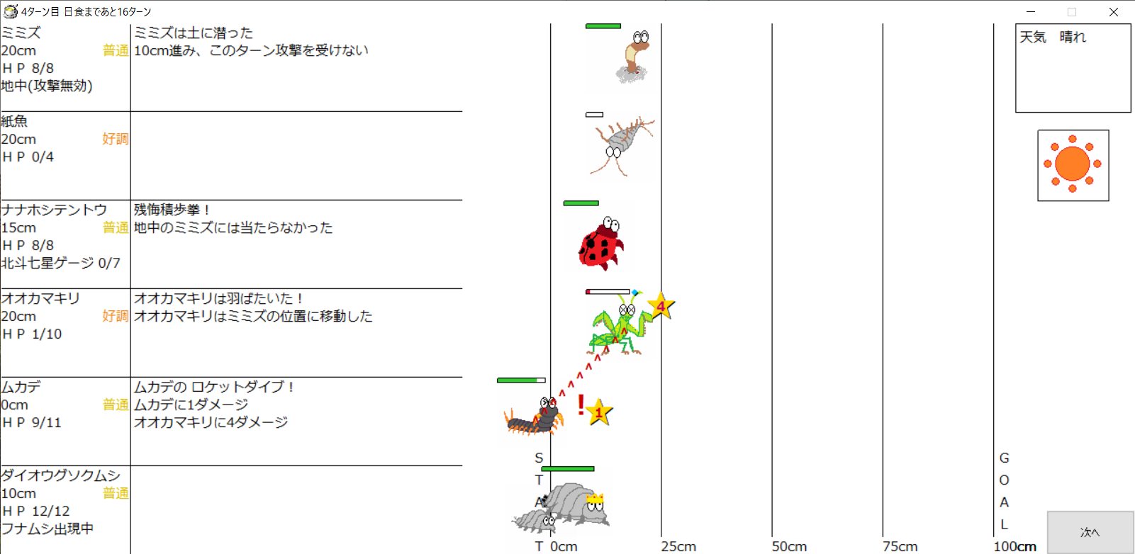 ・一番先にゴールした虫さん、または他のライバルを全滅させた虫さんの勝利