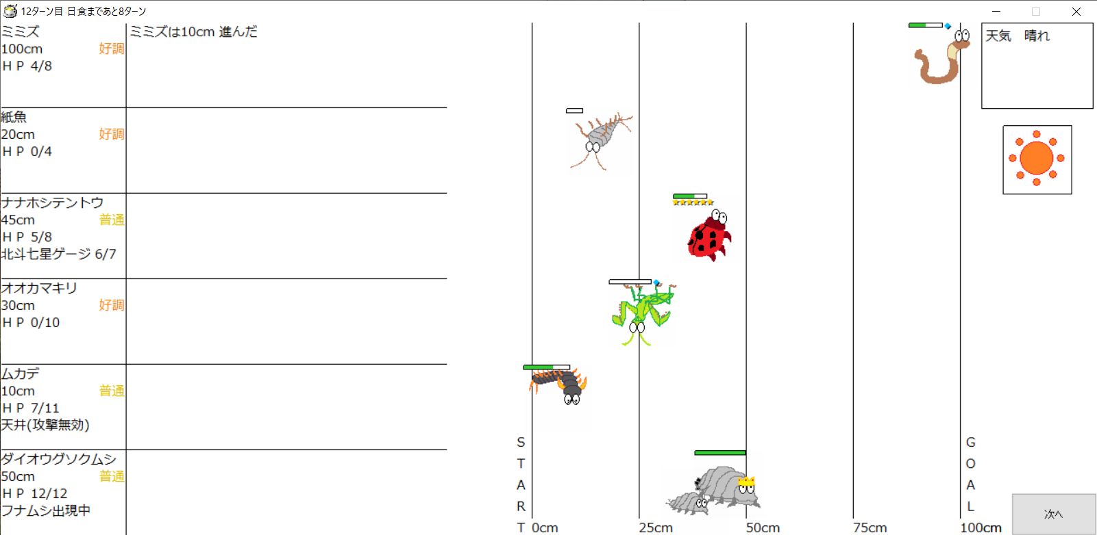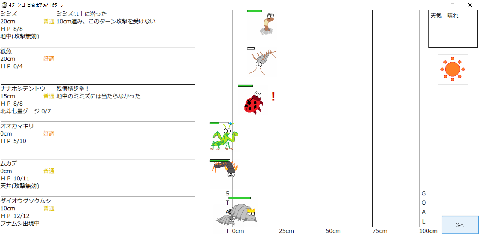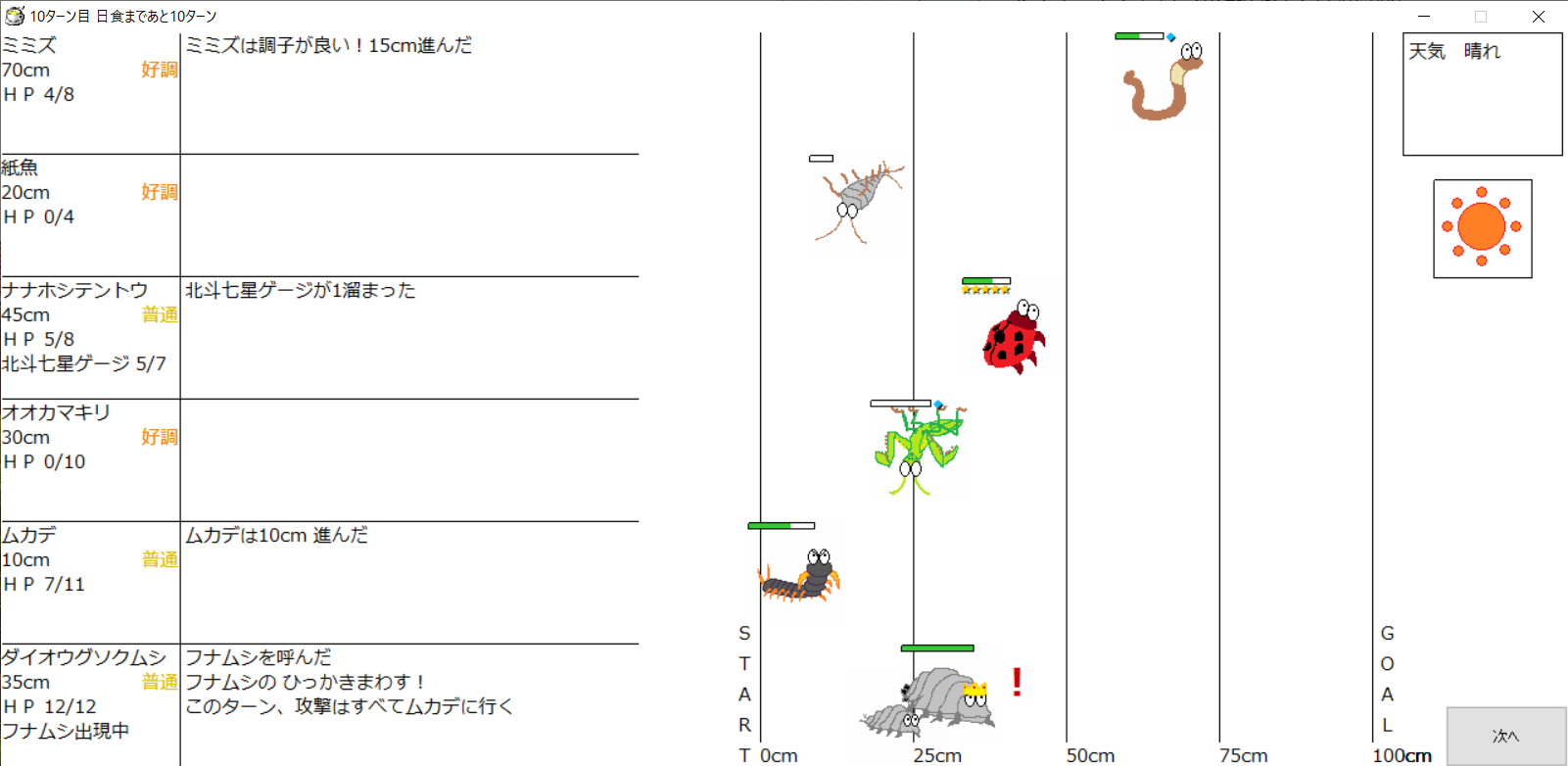 ・一番先にゴールした虫さん、または他のライバルを全滅させた虫さんの勝利