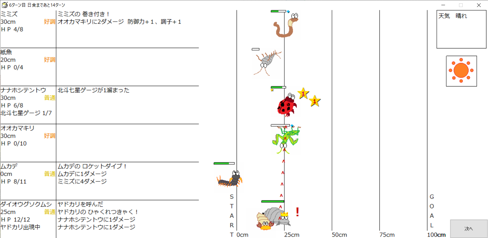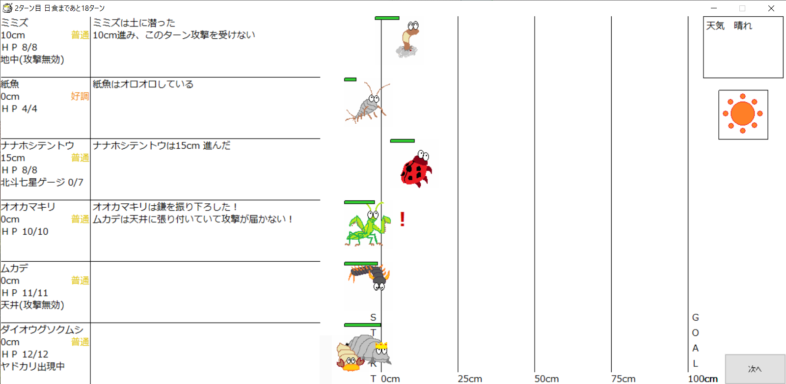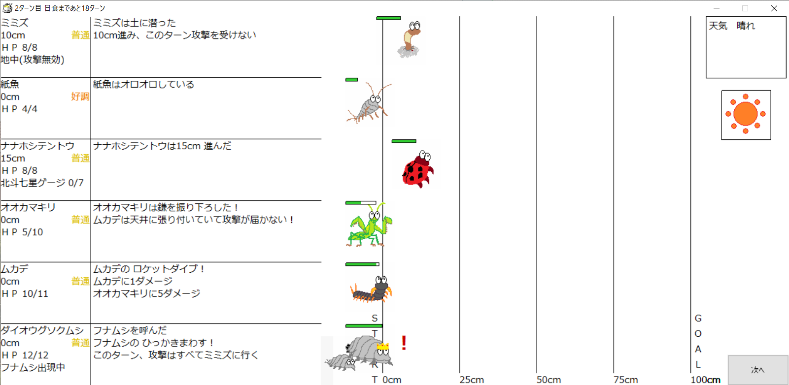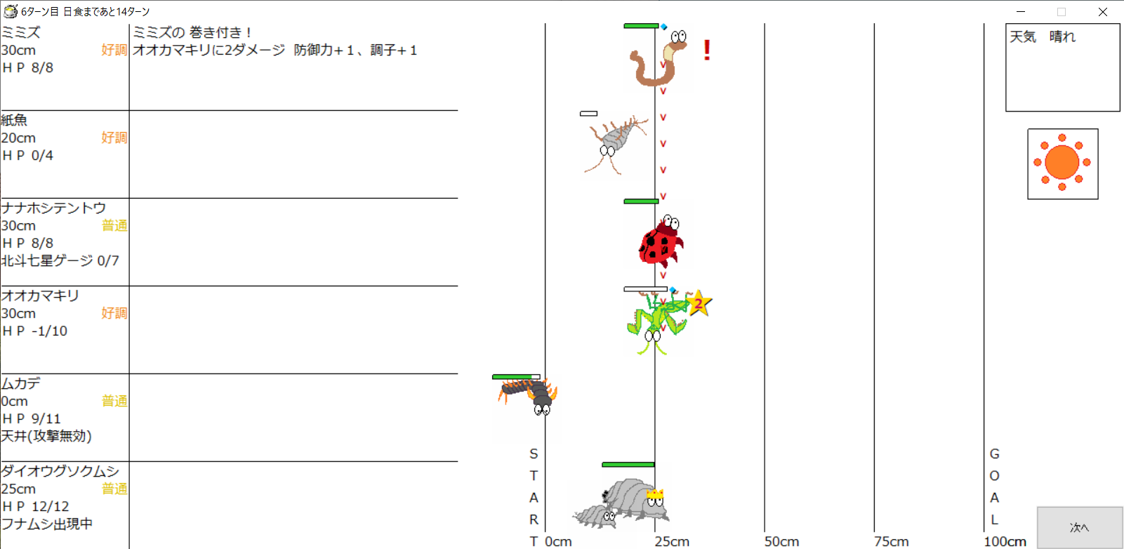 ・1番上の虫さんから順番に行動。行動の抽選は全て乱数に従う