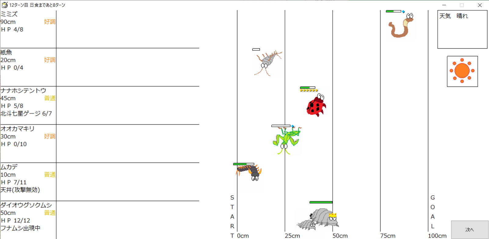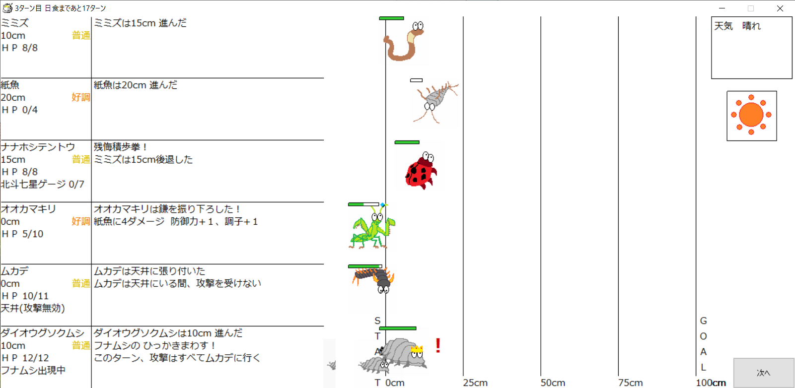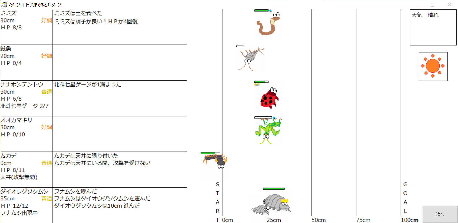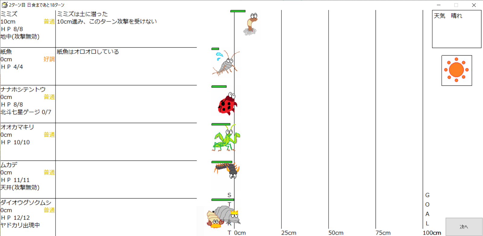・1番上の虫さんから順番に行動。行動の抽選は全て乱数に従う