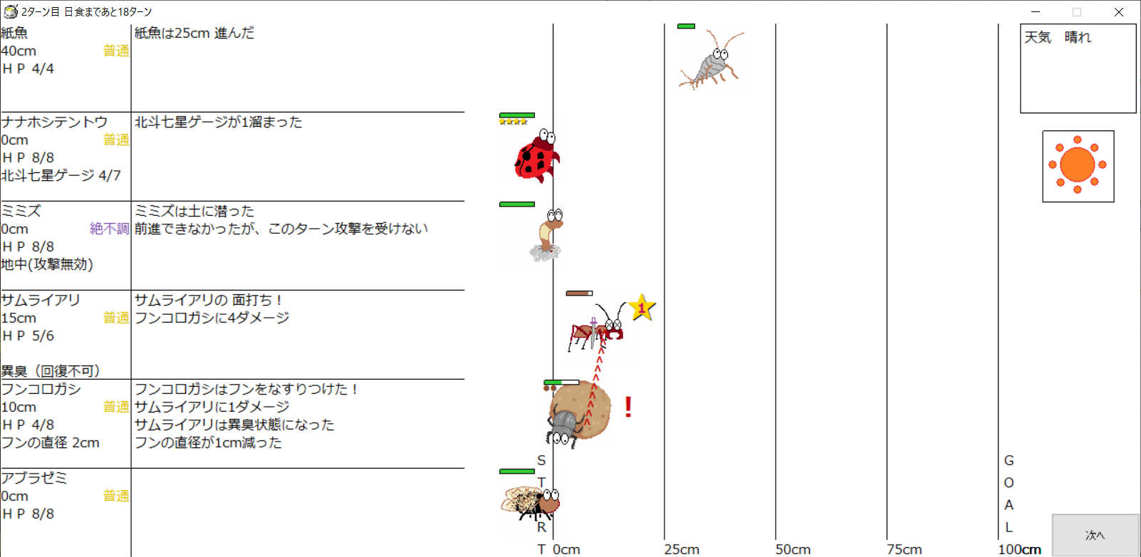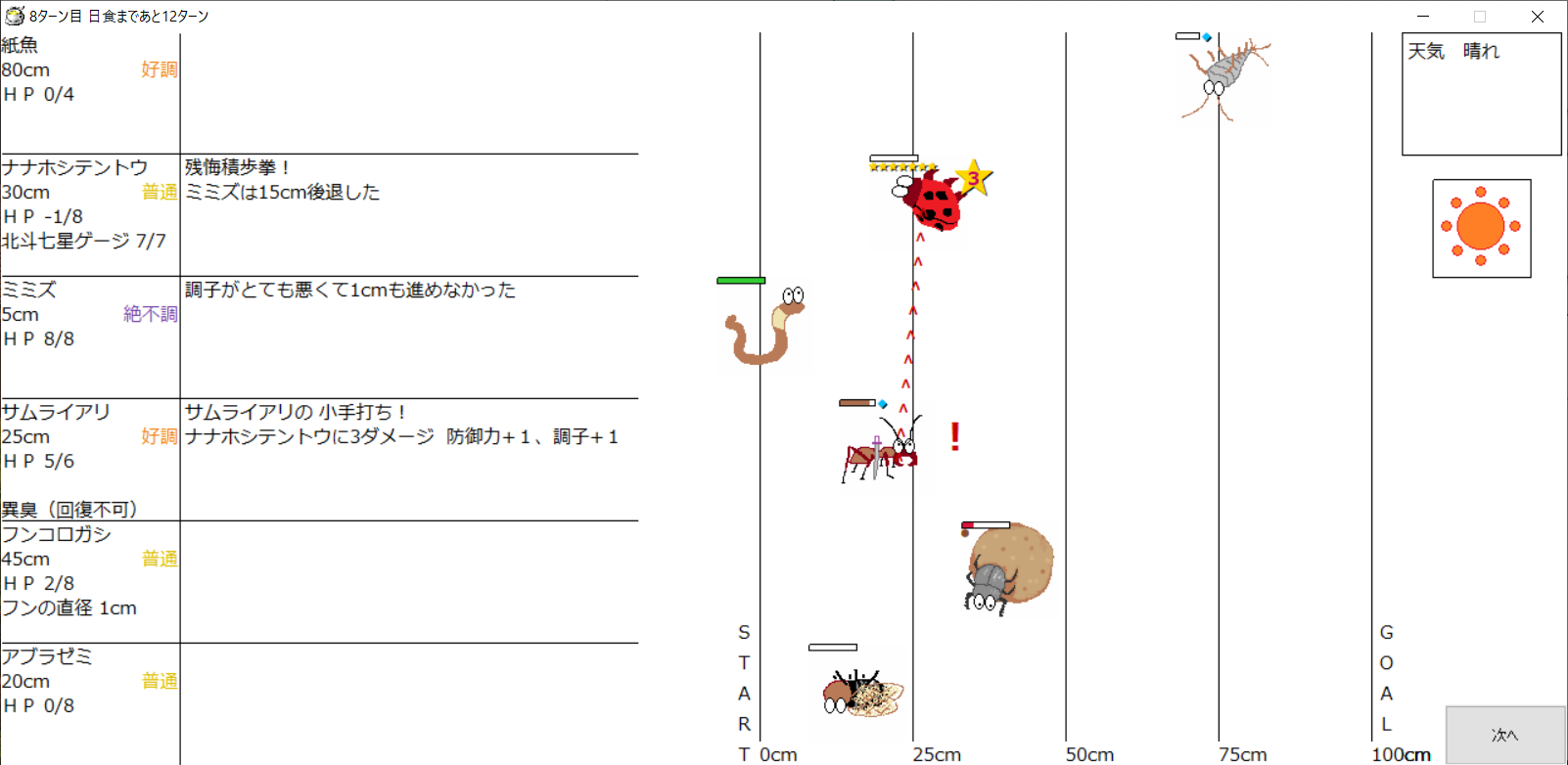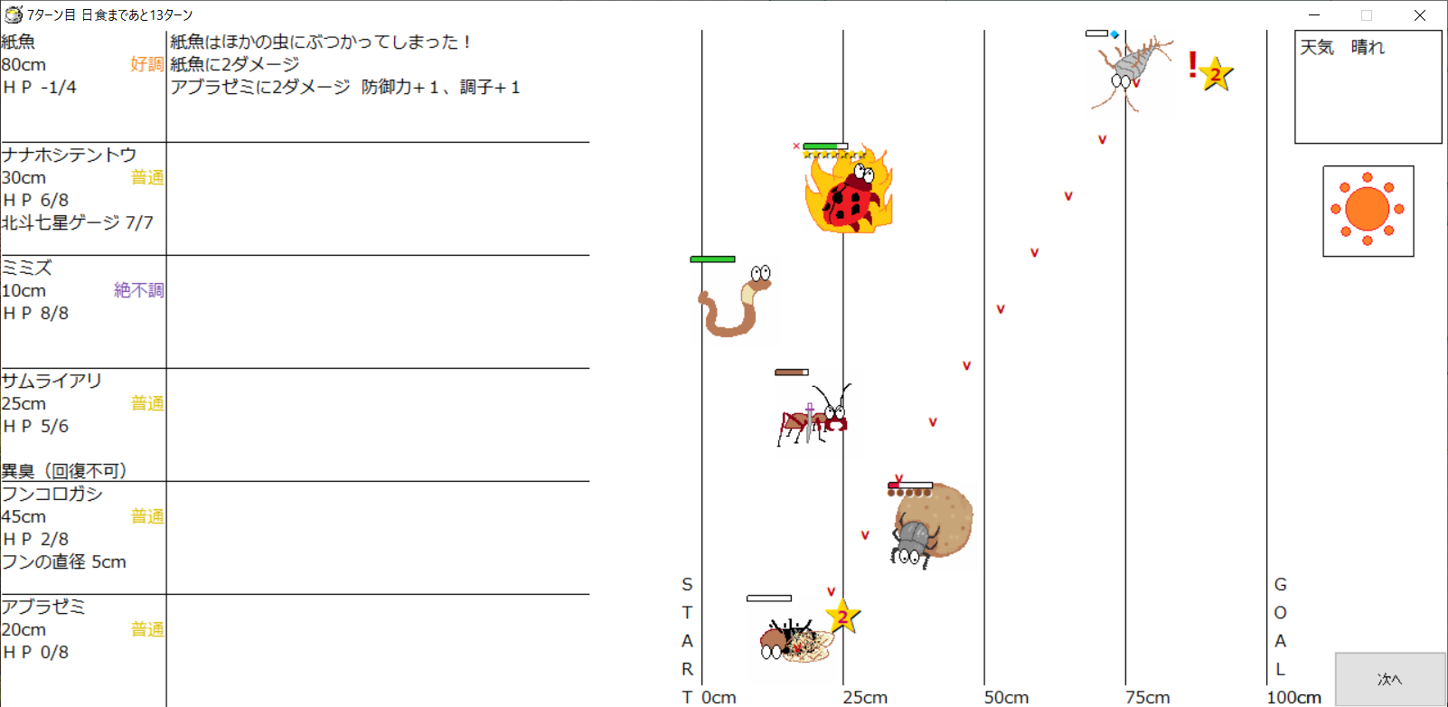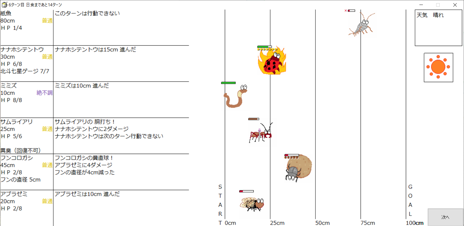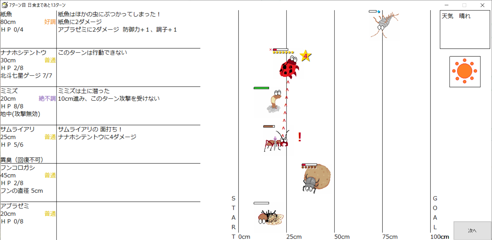 ・1番上の虫さんから順番に行動。行動の抽選は全て乱数に従う