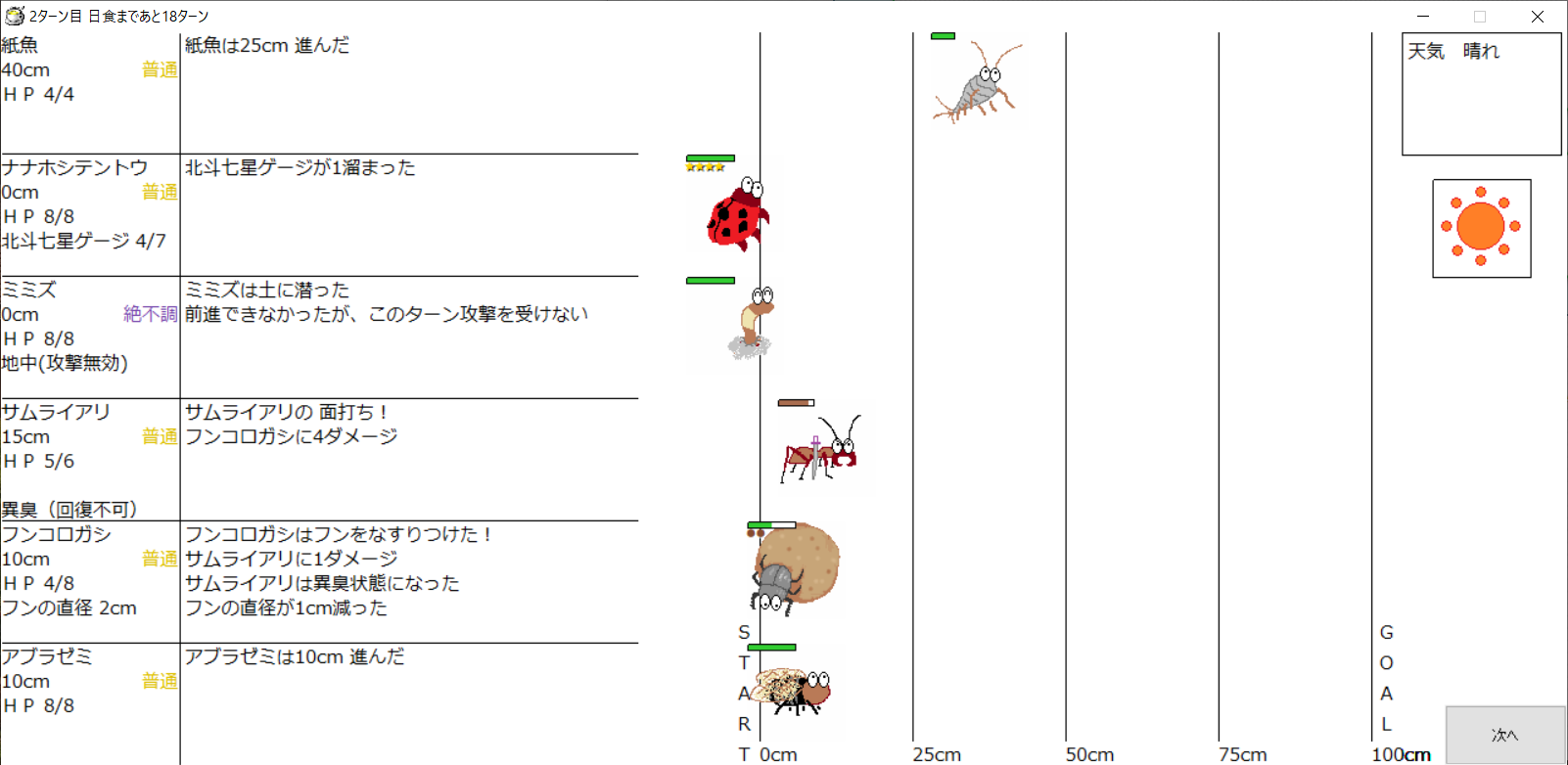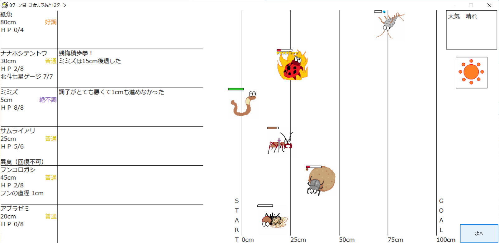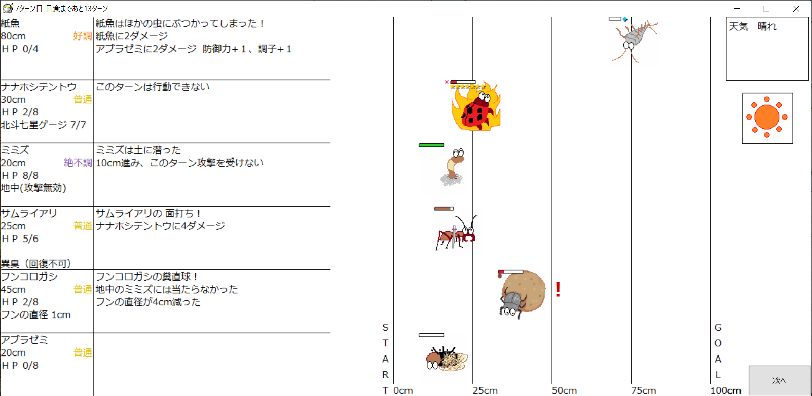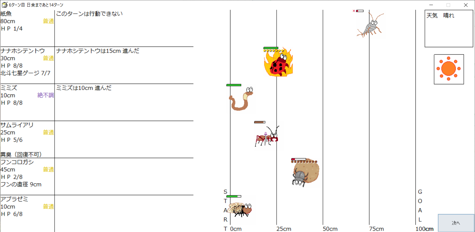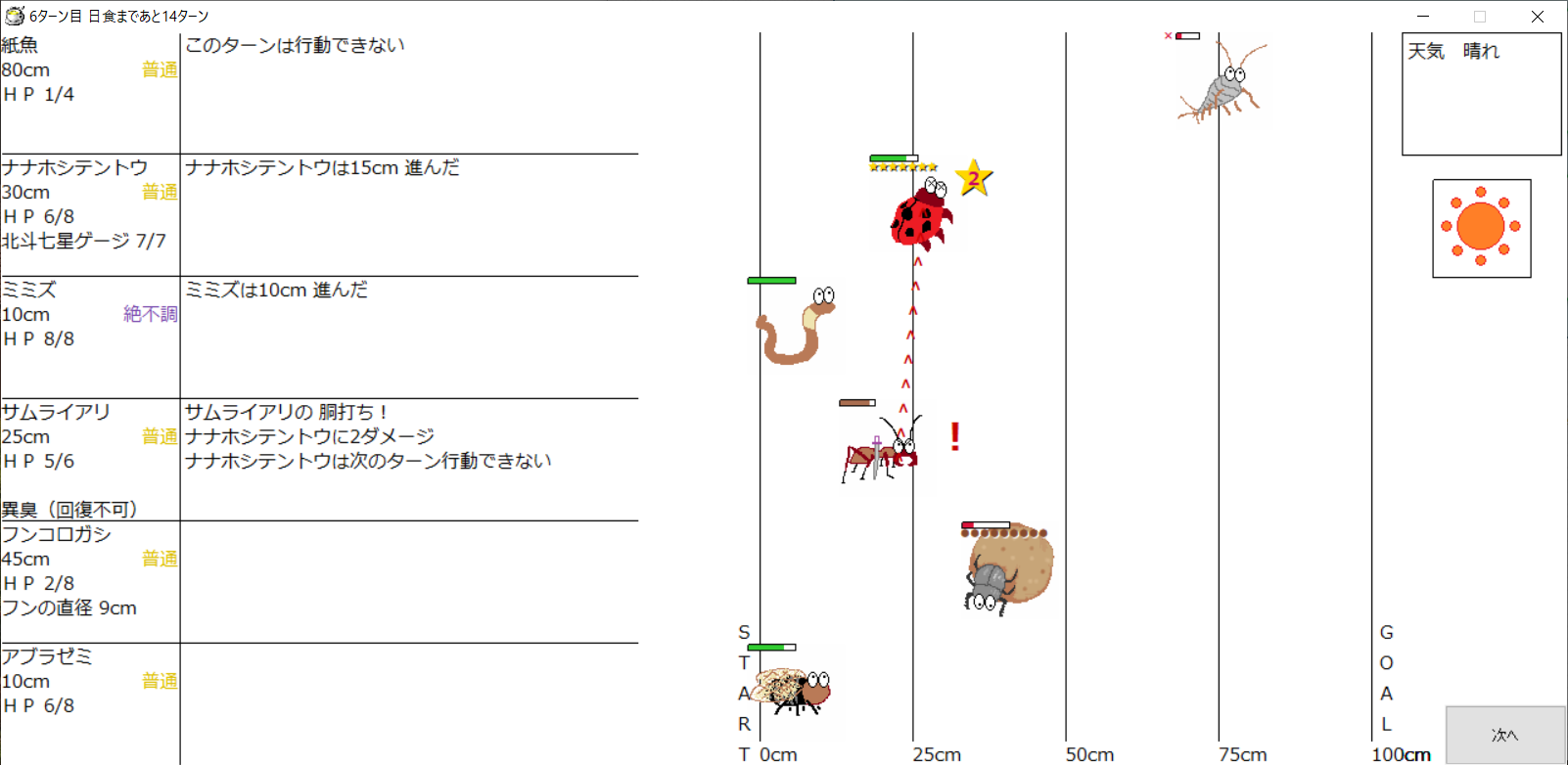 ・1番上の虫さんから順番に行動。行動の抽選は全て乱数に従う