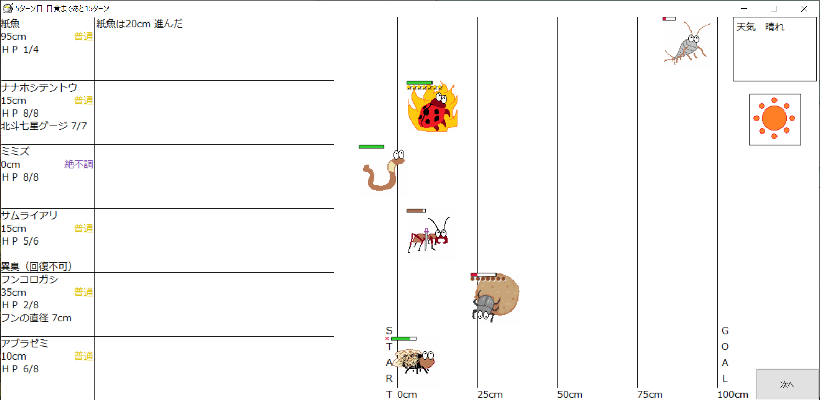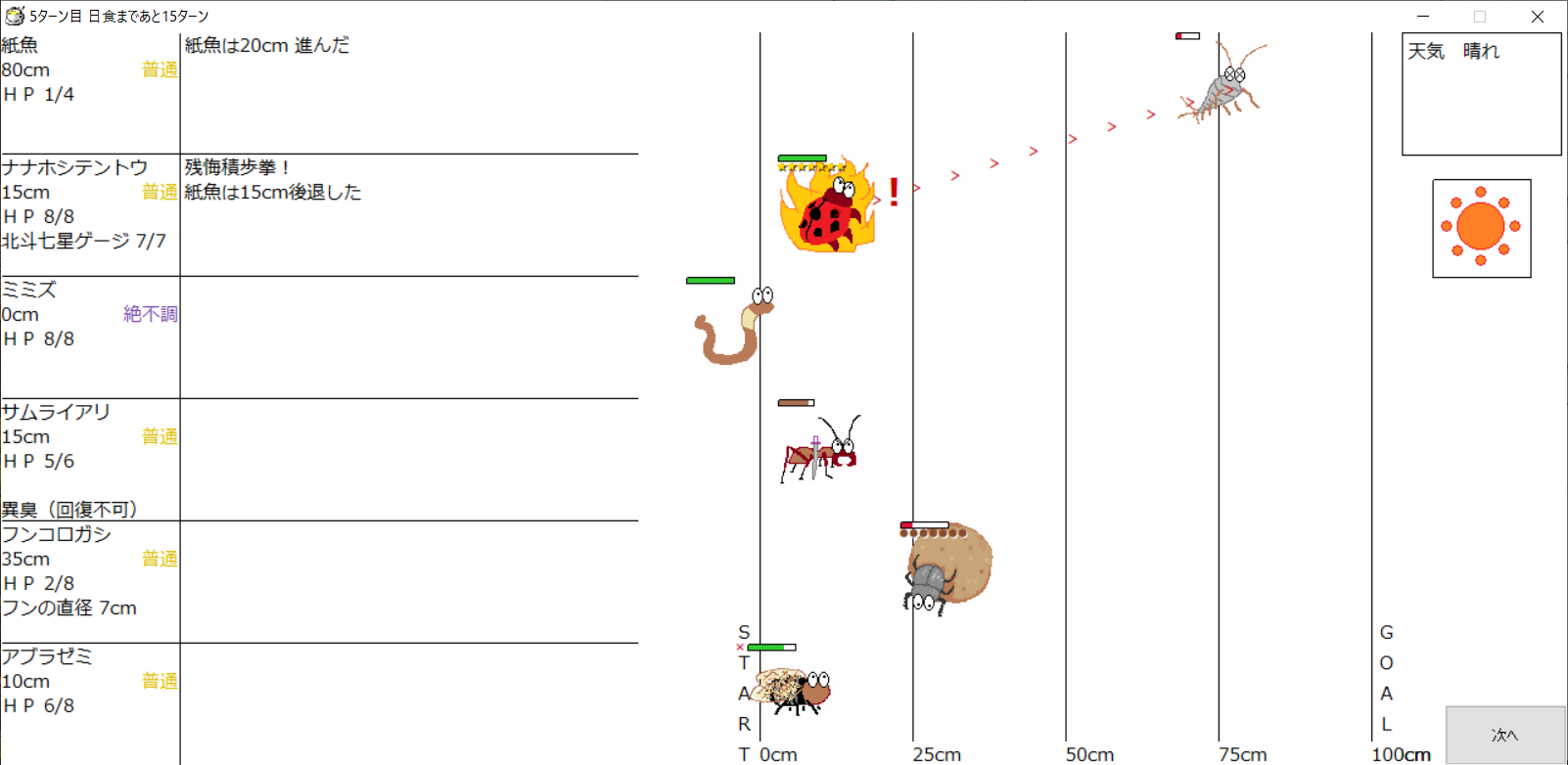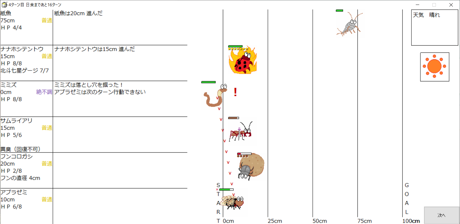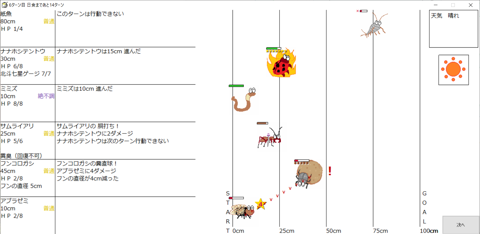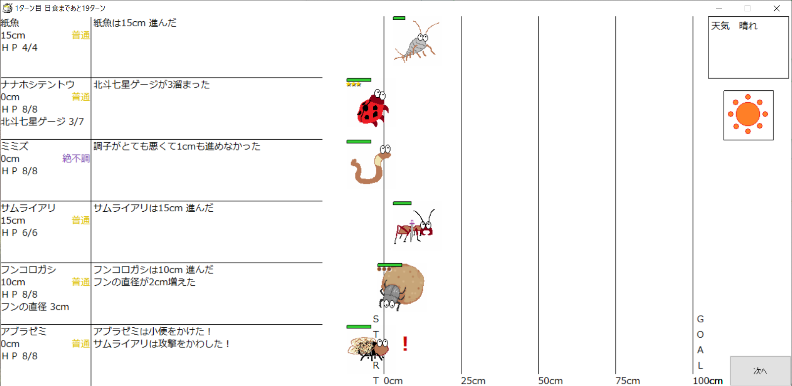 ・1番上の虫さんから順番に行動。行動の抽選は全て乱数に従う