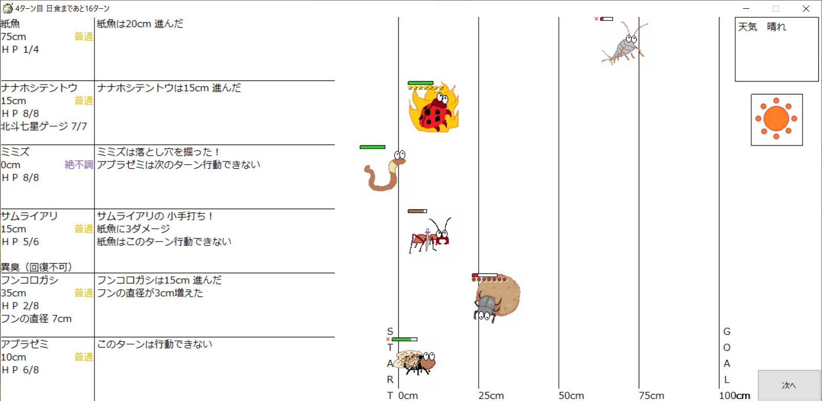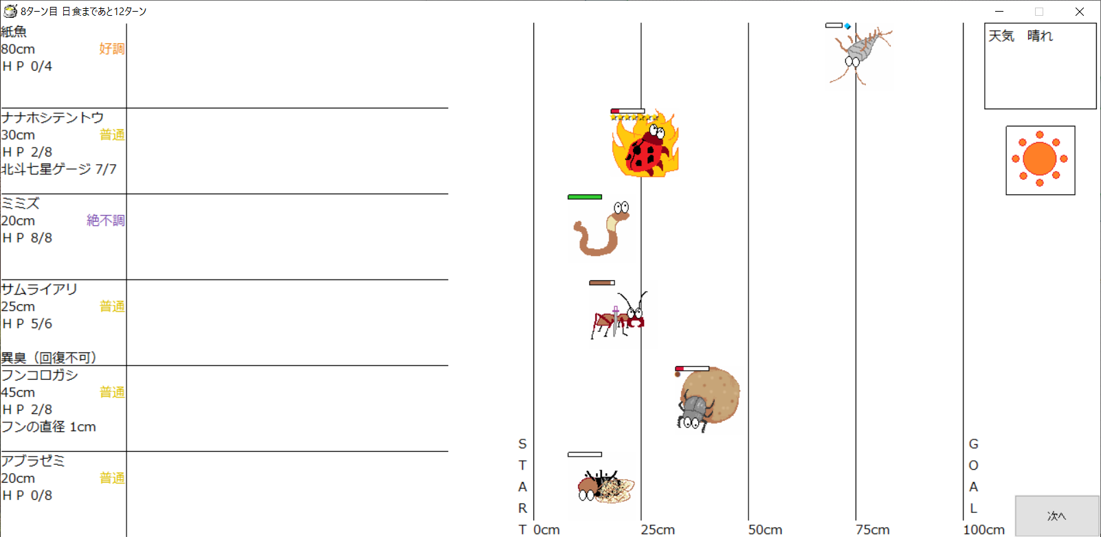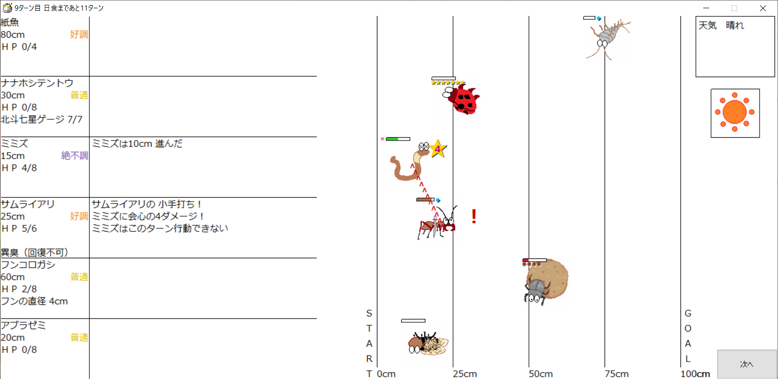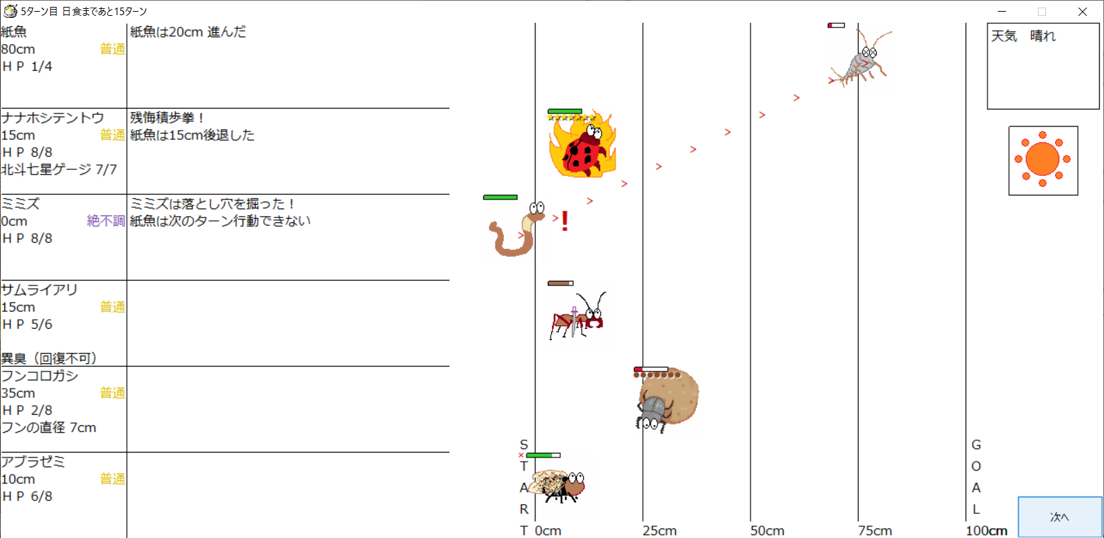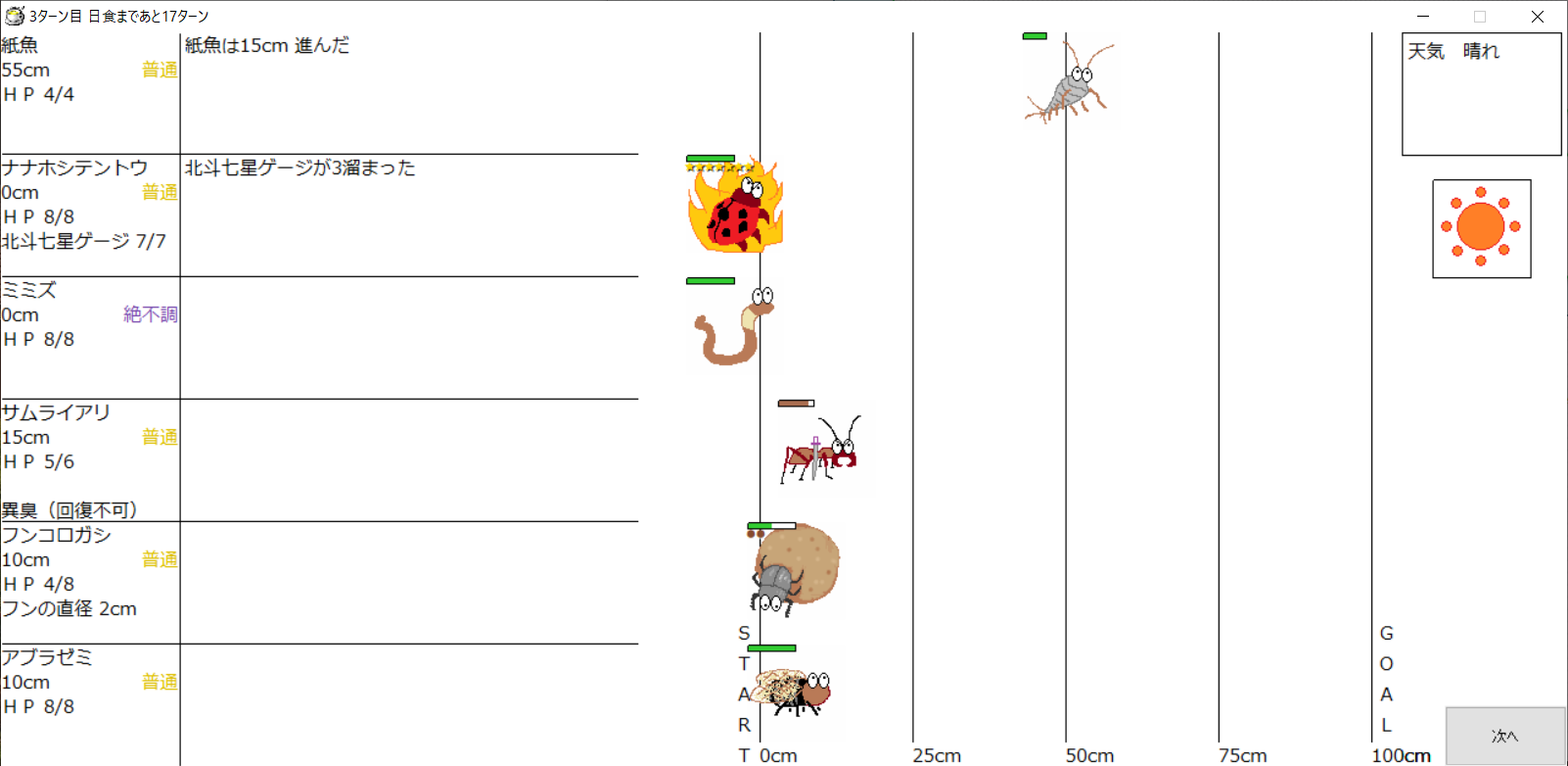 ・1番上の虫さんから順番に行動。行動の抽選は全て乱数に従う