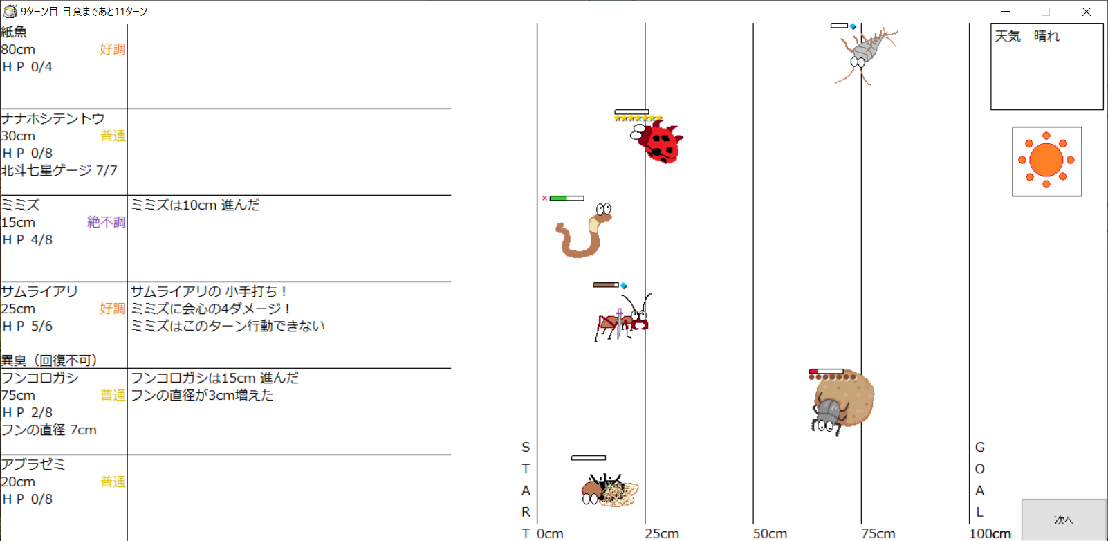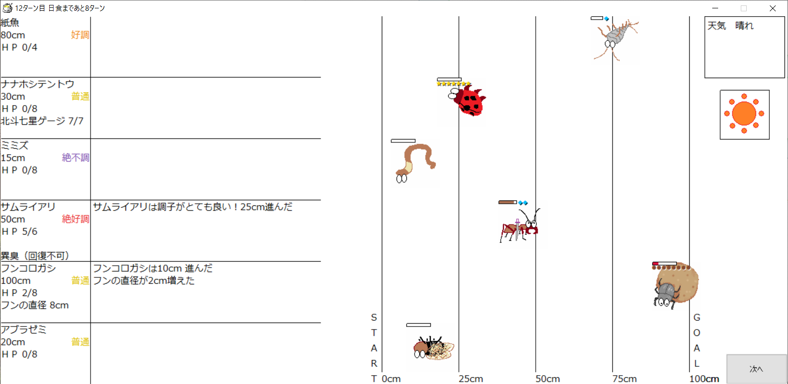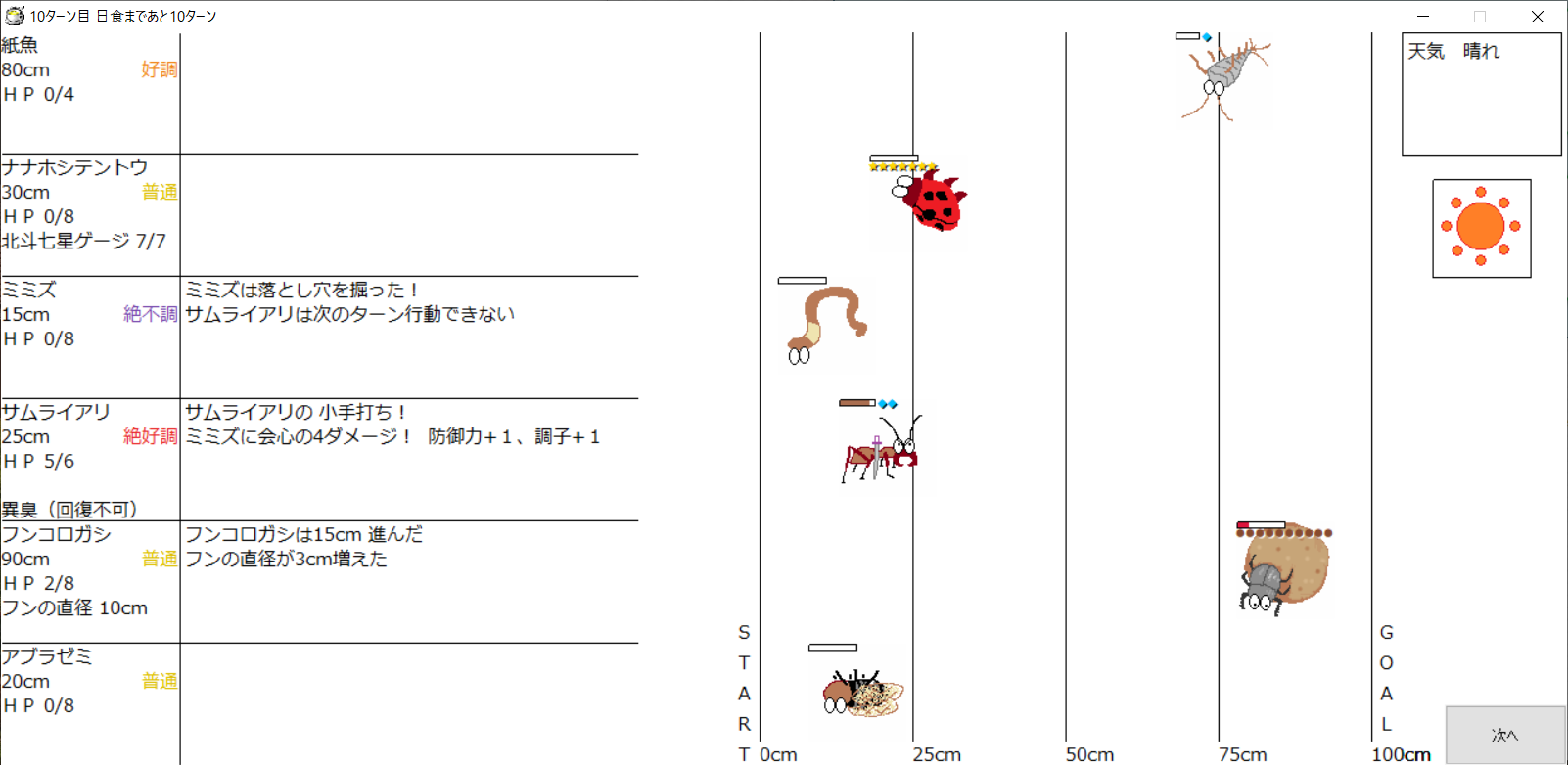 ・一番先にゴールした虫さん、または他のライバルを全滅させた虫さんの勝利
