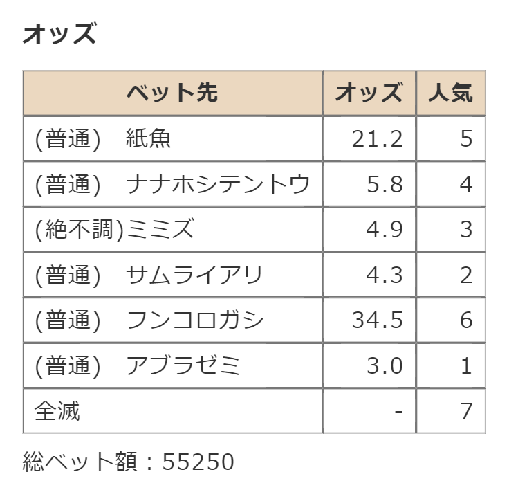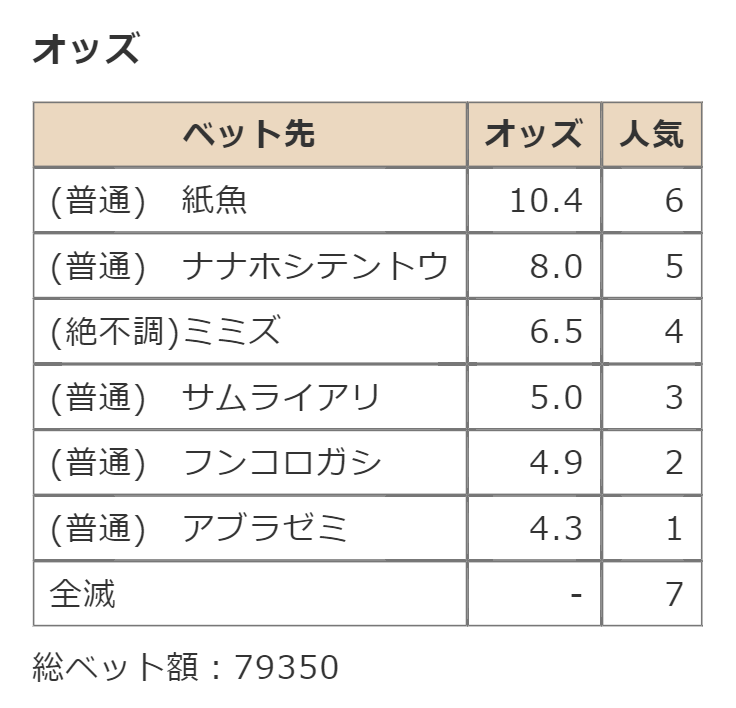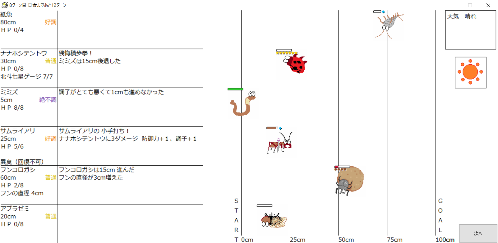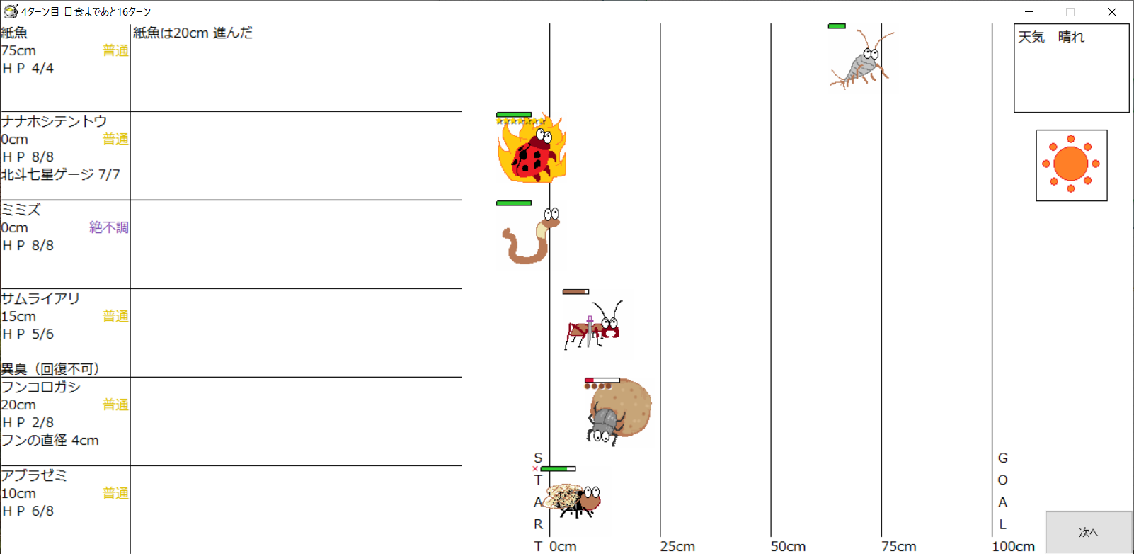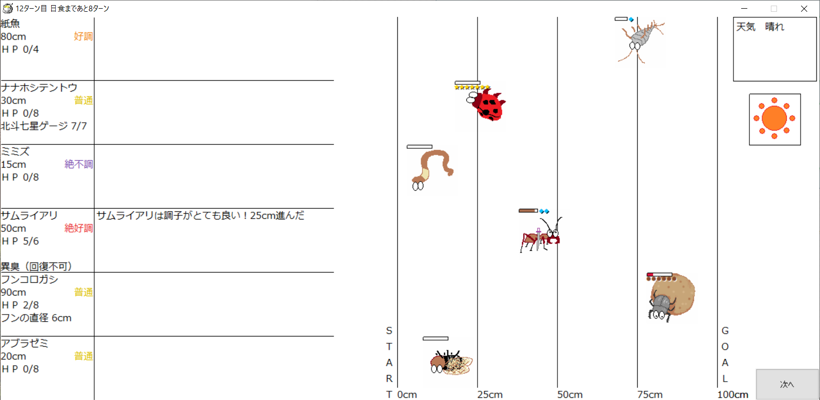 ・一番先にゴールした虫さん、または他のライバルを全滅させた虫さんの勝利
