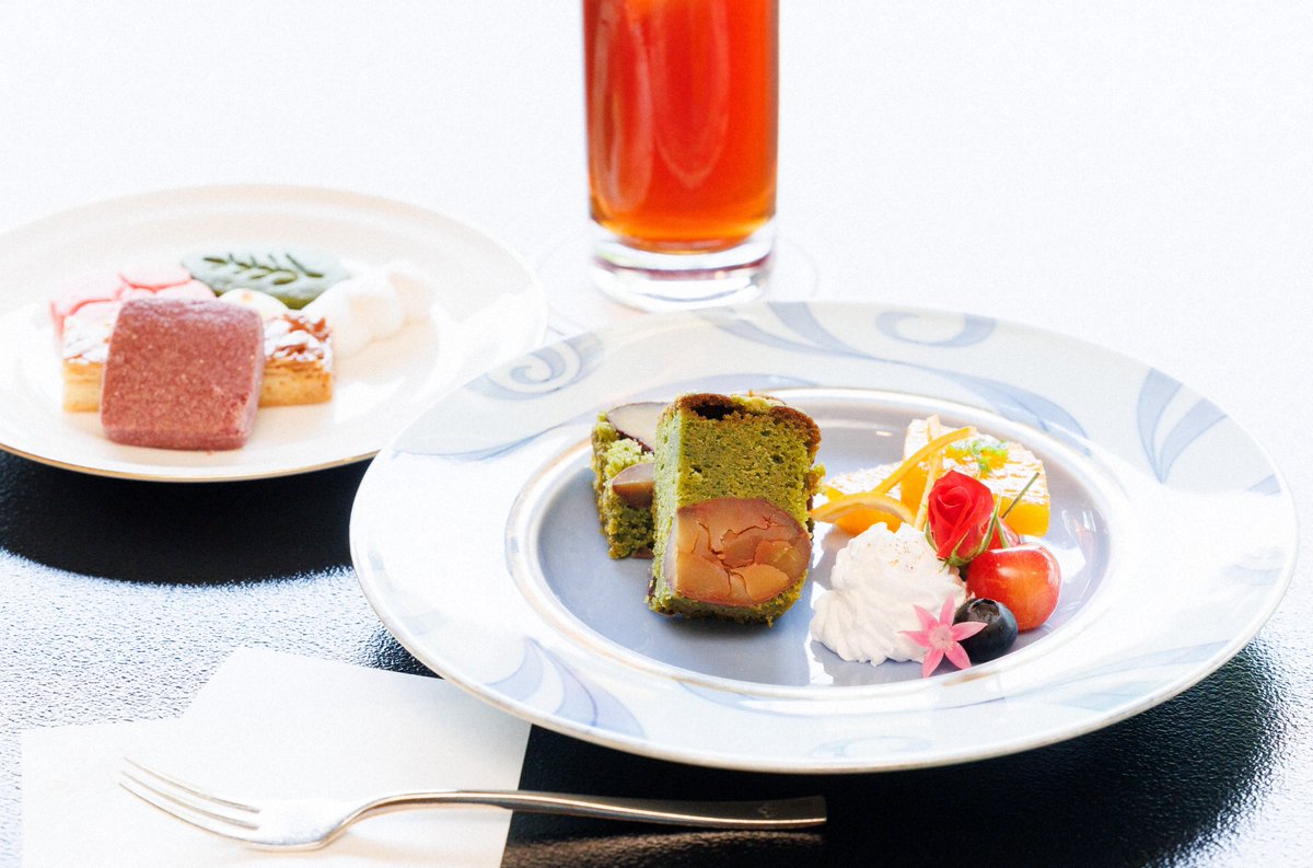藤井名人 抹茶と和栗のパウンドケーキ クリーム&フルーツ添え、アイスティー