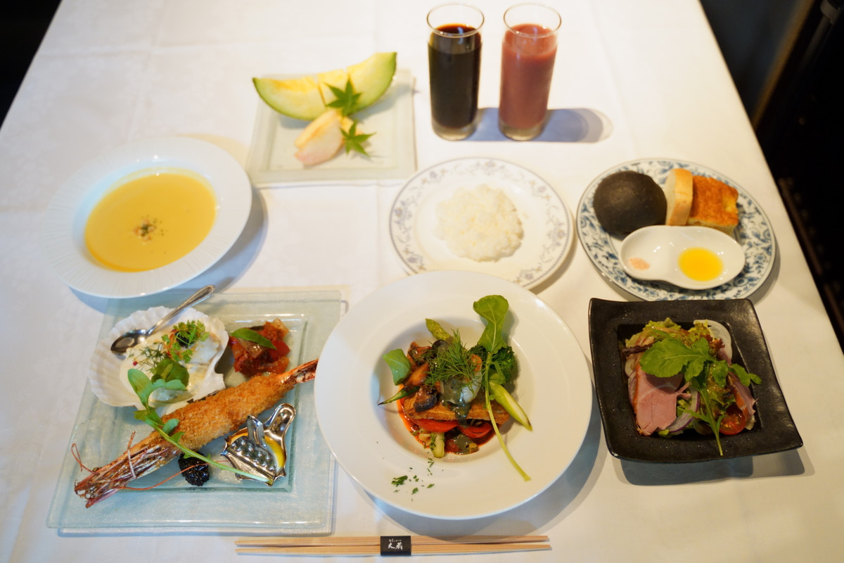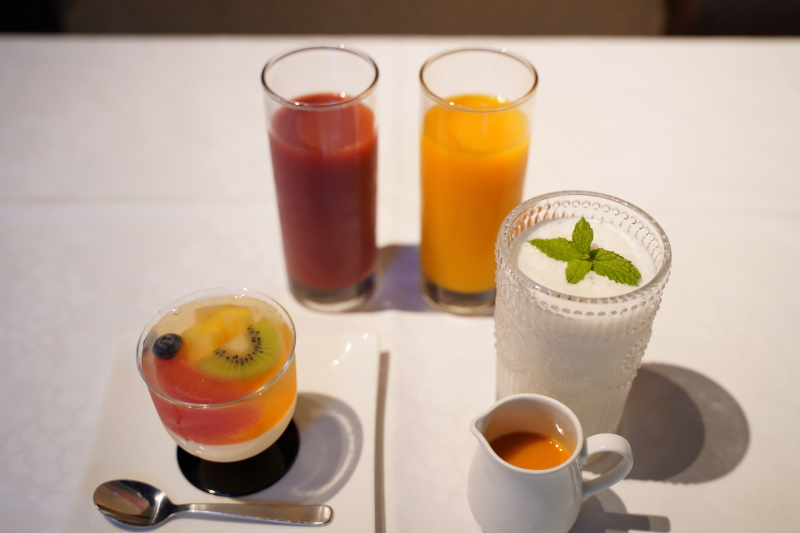 永瀬九段が「極ミックス&名古屋コーチンババロア」、「ラッシー〜マンゴーのピューレ添え〜」、「ブラッドオレンジジュース Yamauchi Farm(愛媛県宇和島)」、「コルシカ島産ミカンジュース Patrick Font(フランス)」。
