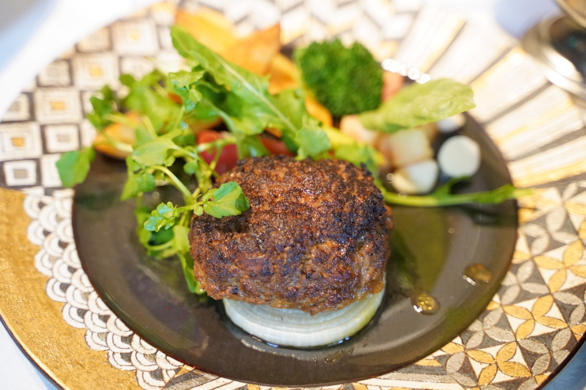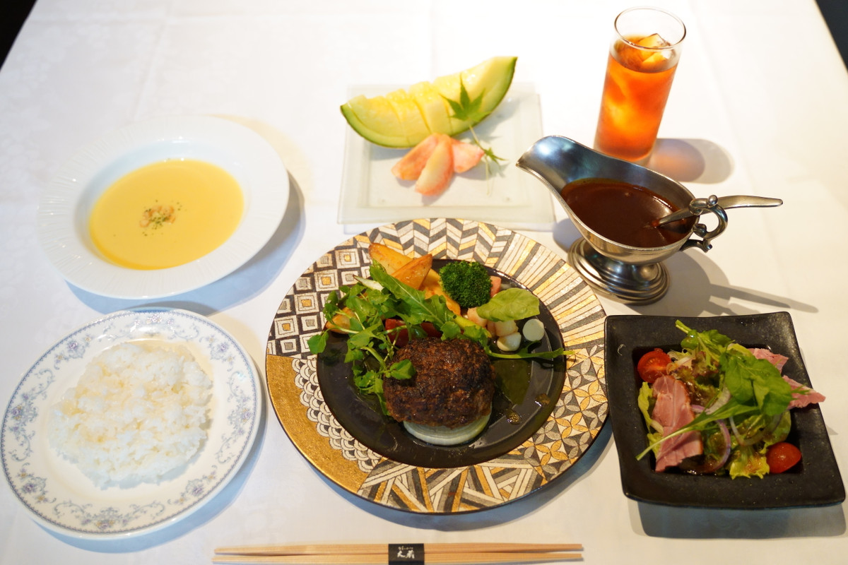 藤井王位が「大藏名物 黒毛和牛ハンバーグ 王位戦スペシャル 自家製デミグラスソース 小牧の桃とモッツァレラチーズのサラダ クレソンとじゃがいものフライ添え ライス」、「紅茶 (アールグレイ Earl Grey)Ice」。