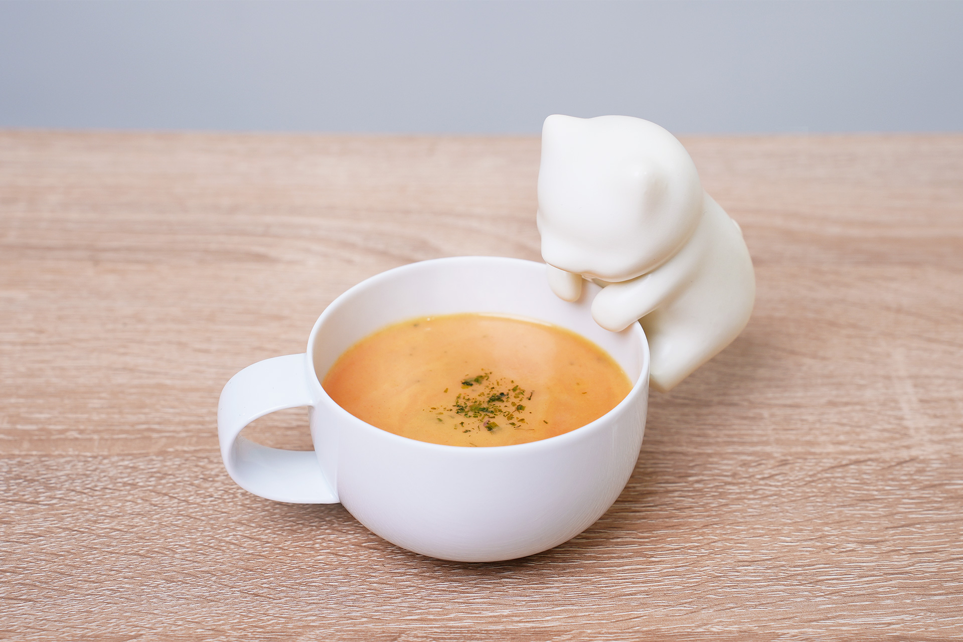 マグカップやスープカップ、深めのお皿など2〜6mmの厚さの食器のフチに引っ掛けられるほか、平皿にもりつけたものは座った姿勢で風を送れる。