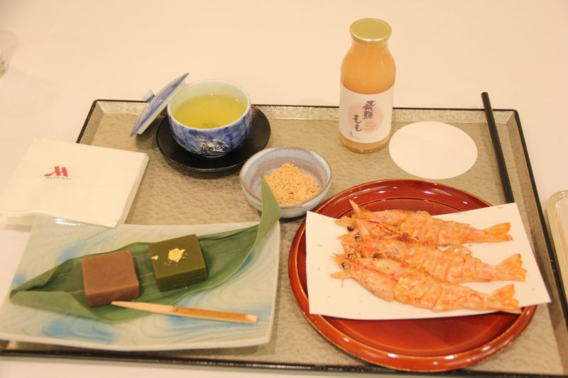 15時、両対局者におやつが用意されました。藤井王座は「モーモーチャ−チャー&名古屋コーチンのエッグタルト」、伊藤叡王は「名古屋土産セット」。飲み物はともに飛騨桃100%ジュースを注文しています。