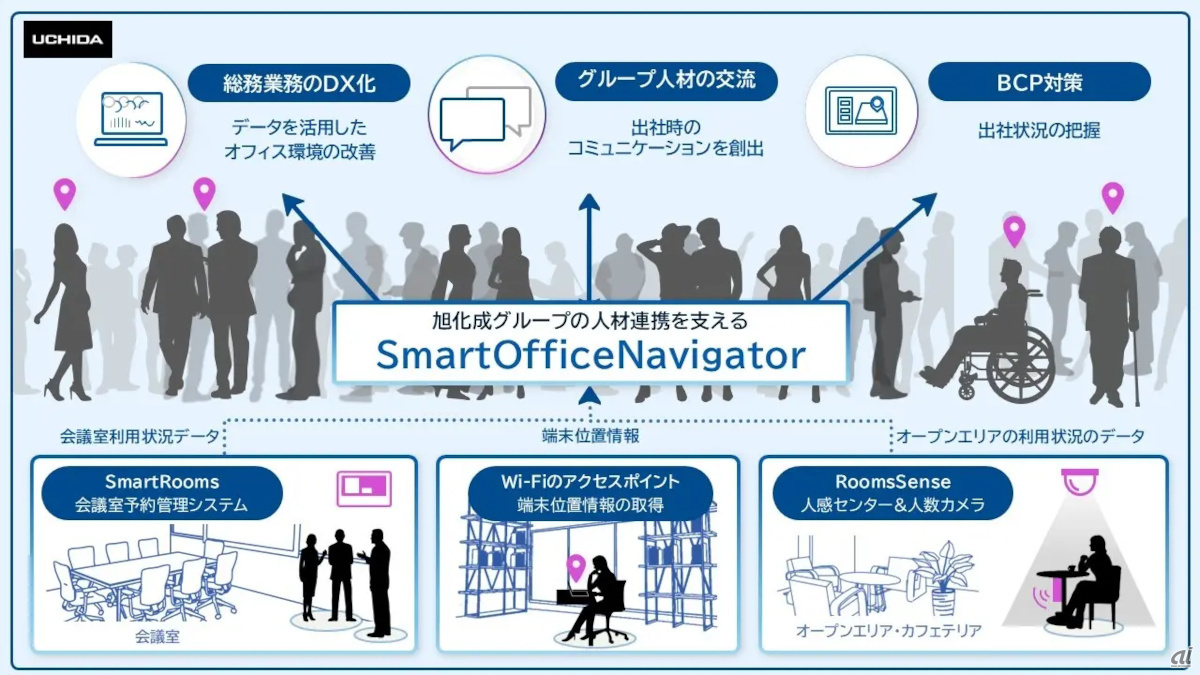 SmartOfficeNavigatorは、デバイスのWi-Fi接続情報を活用し、従業員の居場所をリアルタイムで可視化する。フロア滞在従業員一覧機能として「Microsoft 365」のアカウントと連携し、顔写真や名前、所属情報を自動表示し、リアルタイムでフロアに滞在している従業員情報がわかる。