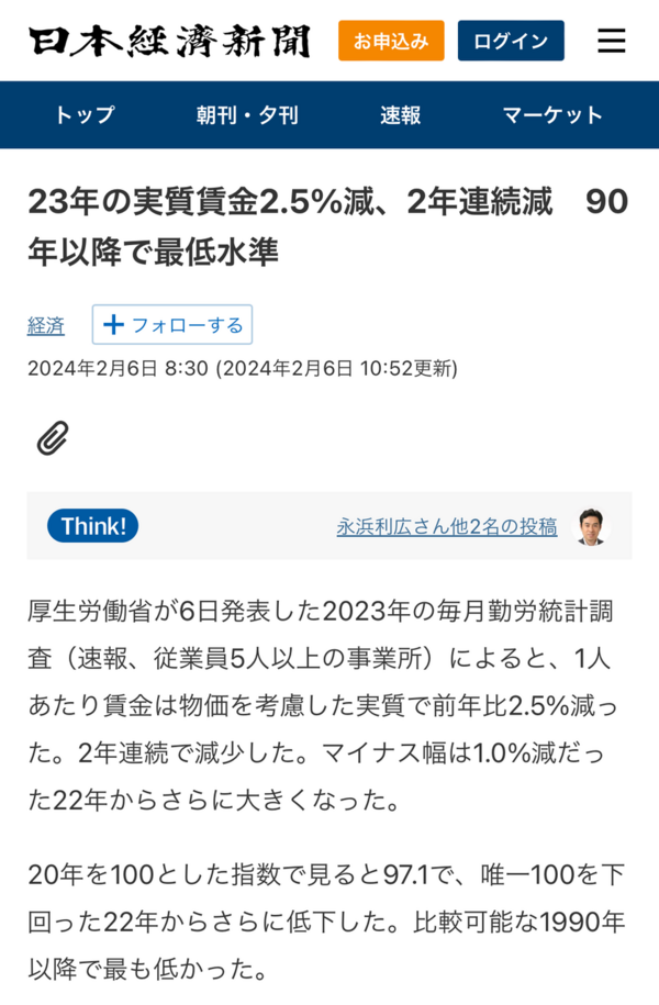 日本人の実質賃金が比較可能な1990年以降で新記録を樹立