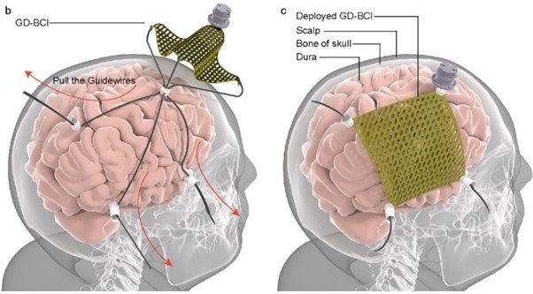 手術では、まず頭蓋骨に8mmの穴を1つ、4mmの穴を3つ開ける。折り畳んだデバイスを8mmの穴から挿入し、デバイスの角に取り付けたガイドワイヤを3つの小さな穴から引き出す。このワイヤを引っ張ることで、デバイスが脳の硬膜上で展開される。標準的な脳外科器具のみを使用し、手術は約2時間で完了する。
