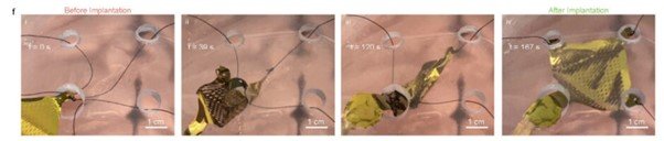 このデバイスは、厚さ21μmの極薄フィルム電極アレイ。2cm四方の面積に256個の電極を配置したこのデバイスは、折り畳んで小さな穴から挿入し、脳を覆う硬膜の上で4平方cmまで展開できる。
